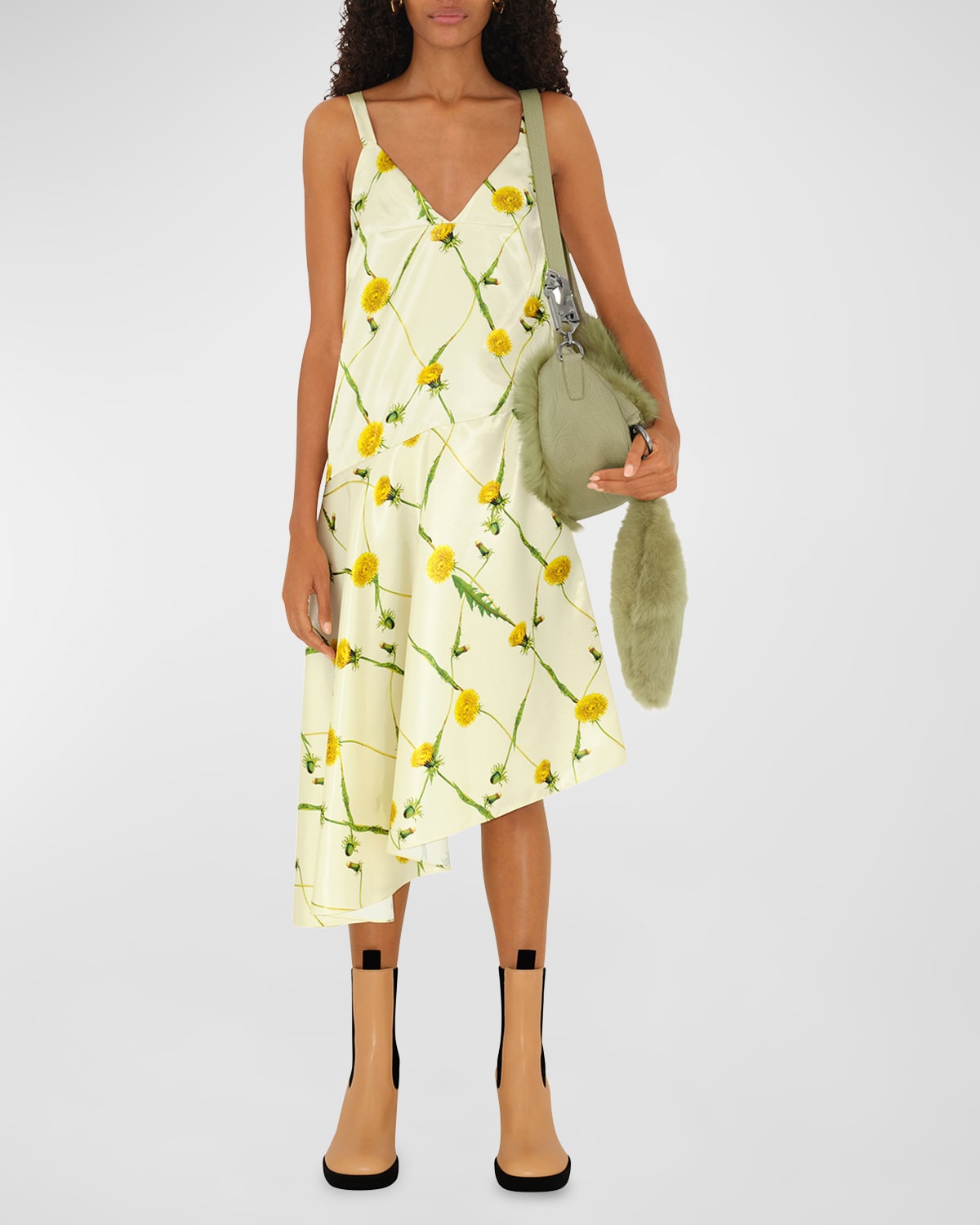 Burberry asymmetric mini dress in an allover floral print Vneckline Sleeveless Highlow hem Aline silhouette Polyester Lining: Silk Dry clean, professional cleaning recommended Made in Italy
