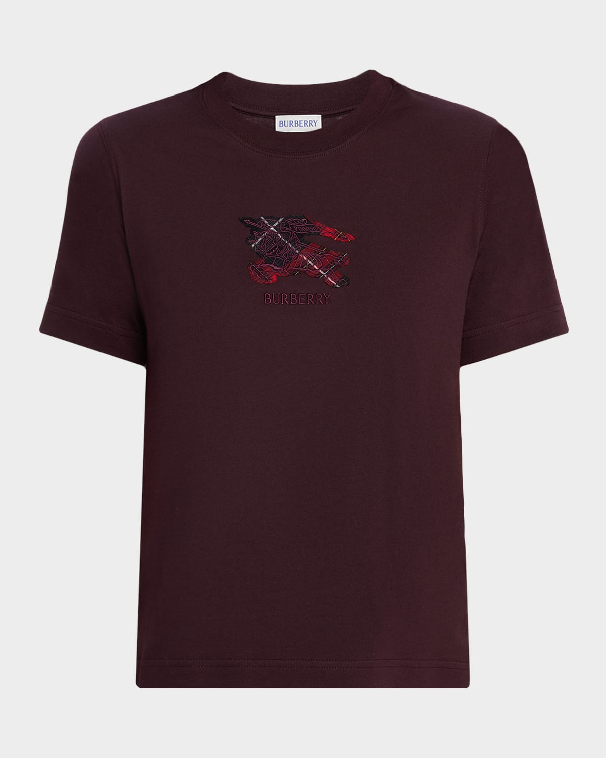 Burberry "Frankie" Tshirt features a signature check EKD embroidered chest Crew neckline Short sleeves Relaxed fit Pullover style Cotton/elastane Made in Portugal