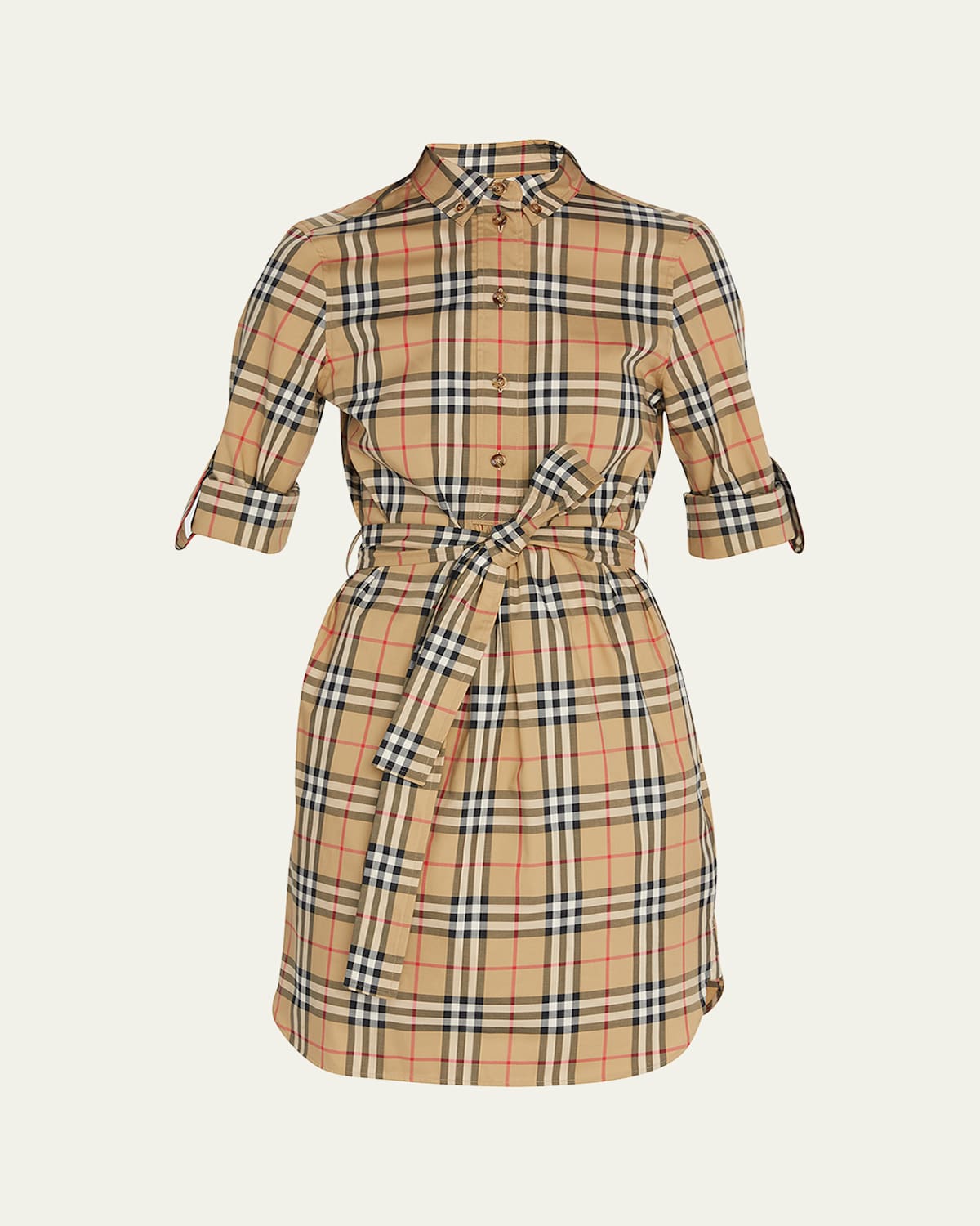 Burberry 'Giovanna" shirtdress in vintagecheck cotton twill. Approx. length: 38" size 8. Spread collar; button front. Half sleeves; tabbed cuffs. Self sash at waist. Aline silhouette. Hem falls below the knee. Cotton/spandex. Polyester trim. Machine wash. Imported.