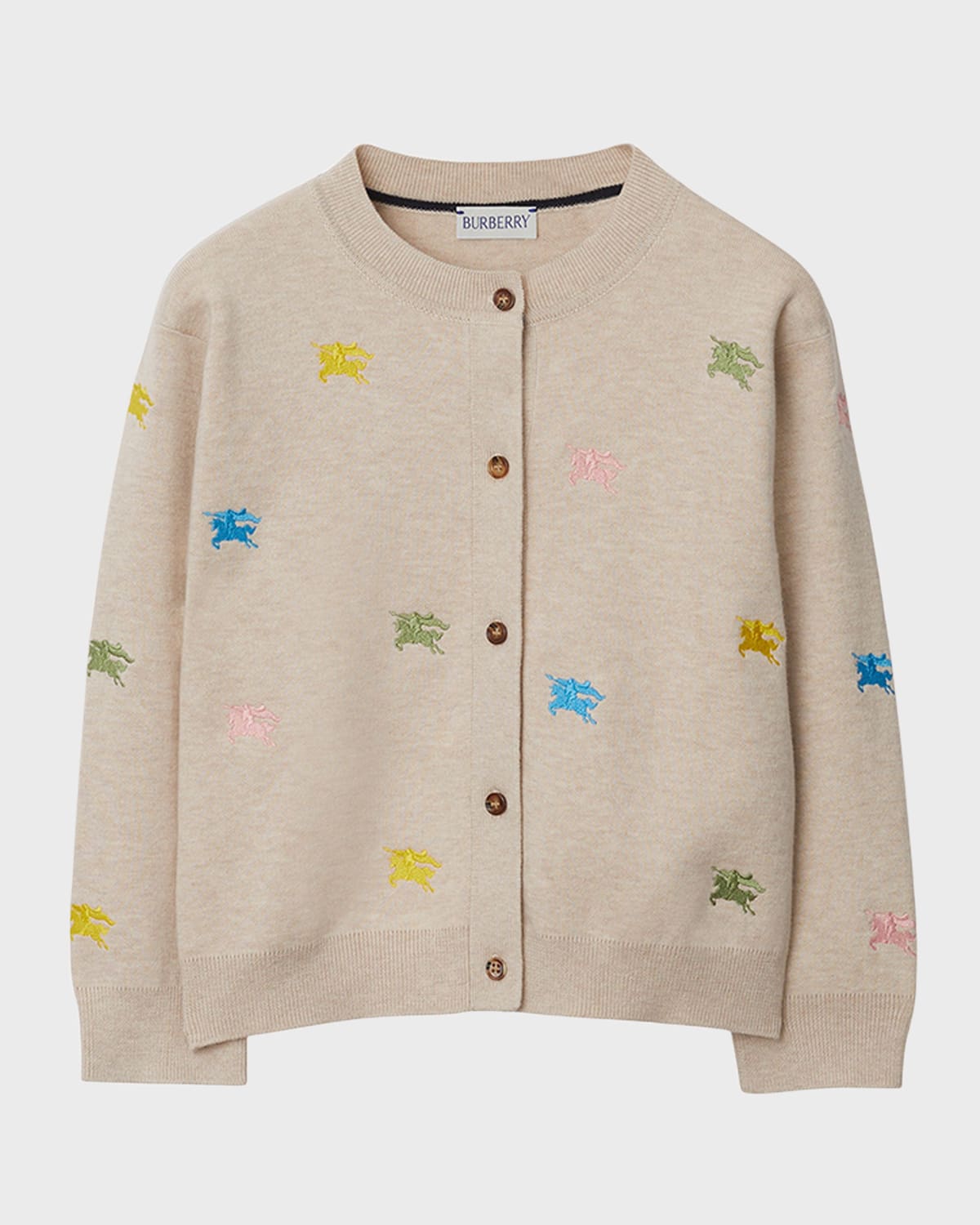 Burberry "Cordelia" cardigan with allover multicolor Equestrian Knight Design embroidery Crew neckline Full button front Long sleeves Ribknit cuffs and hem Cotton/cashmere/wool Hand wash Imported