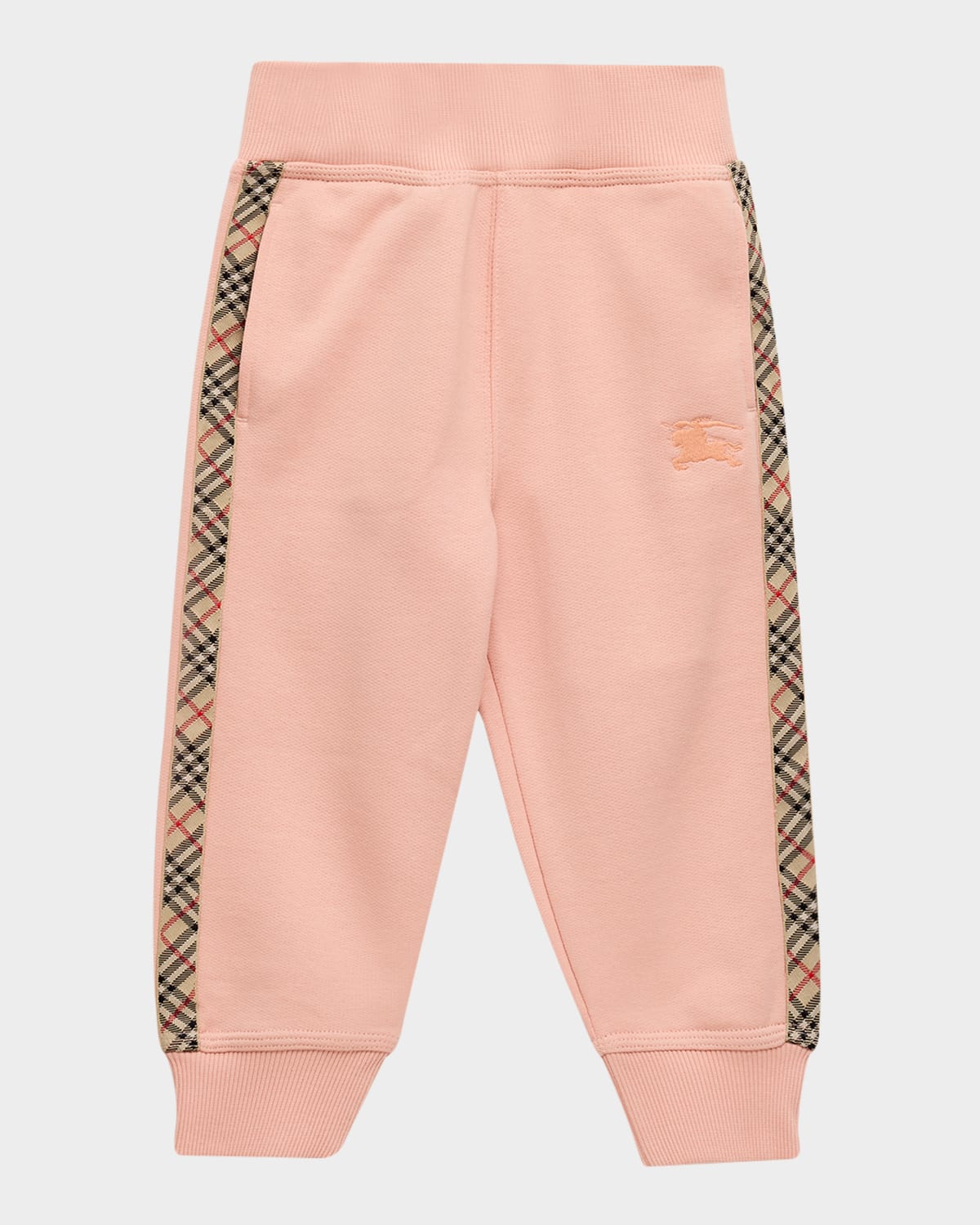 Burberry "Jackson" joggers in loopback cotton, framed with check taping at the sides in signature archival check. The style is embroidered with a tonal Equestrian Knight Design. Elasticated waist Side slip pockets Embroidered equestrian knight design on side Ribknit trims Full length Pullon style Cotton Machine wash Imported