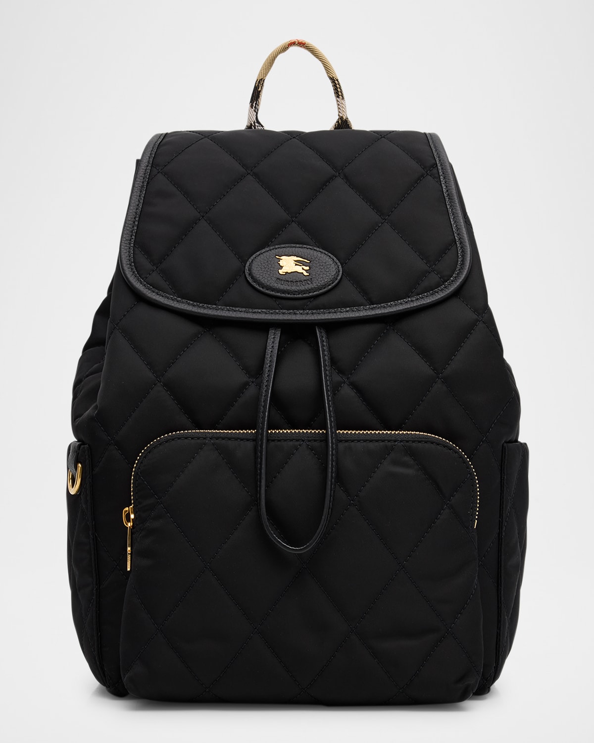 This "Horseshoe" backpack from Burberry is crafted in diamondquilted nylon with signature Check straps and iconic Equestrian Knight stamp accent Woven top handle Adjustable shoulder straps Flap top with drawstring and magnetic closure Exterior, front zip pocket, two slip pockets Interior, one slip pocket Lining: Leather Trim: Leather Approx. 13.6"H x 8.3"W x 5.1"D Imported Dust bag included
