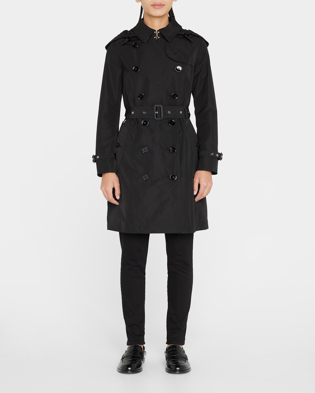 Burberry "Kensington" fit trench coat in taffeta. Spread collar with throat latch; detachable hood. Approx. 37.4"L from shoulder to hem. Doublebreasted button front. Long sleeves; belted cuffs. Adjustable self belt may be tied, buckled, or removed. Buttonthrough pocket detail. Relaxed fit. Polyester, self/lining. Machine wash. Imported.