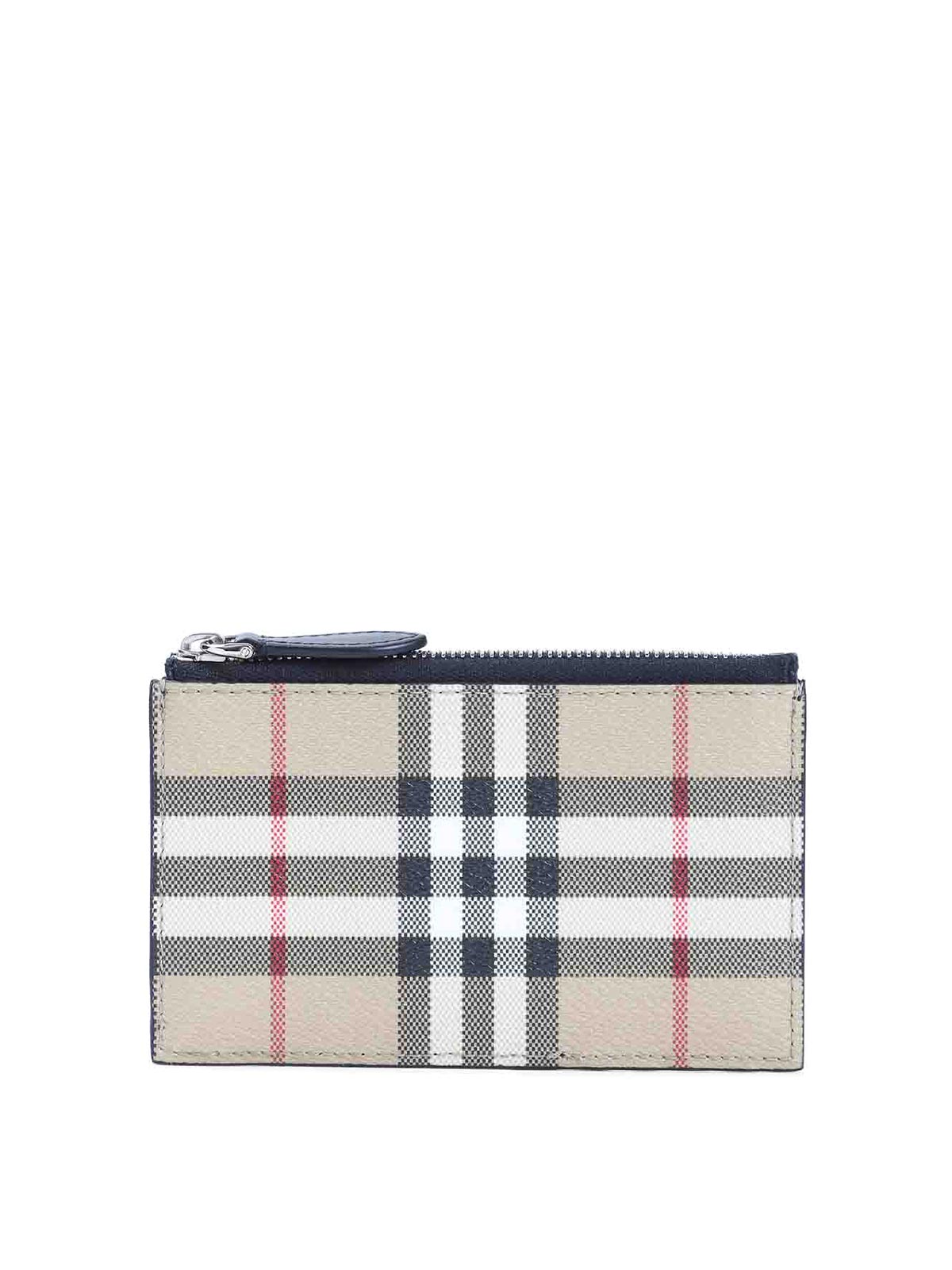 Étui pour cartes de crédit Burberry Alwyn beige fabriqué à partir de carreaux beige archive et de détails noirs, fermeture éclair sur le dessus, cinq emplacements pour cartes au dos