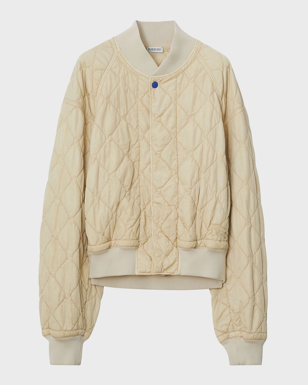 Burberry quilted bomber jacket featuring EKD embroidered front and contrast snap button Baseball collar; snap front Long sleeves Drop shoulders Loose fit Ribbed cuffs and hem Nylon/polyamide/polyester Polyester, fill Made in Italy