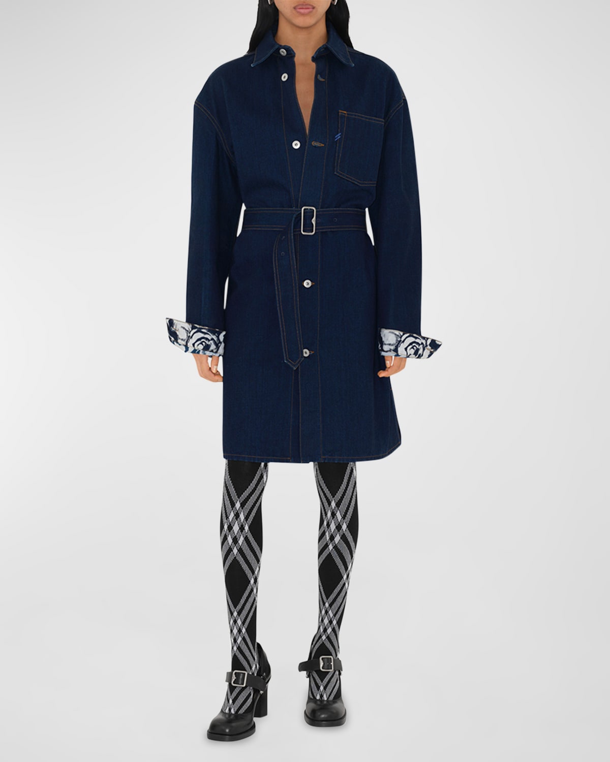 Burberry denim shirtdress featuring roseprinted cuff inner and a selfbelt Point collar; button front Long sleeves; button cuffs Chest patch pocket Aline silhouette Knee length Cotton Trim: Leather Made in Italy