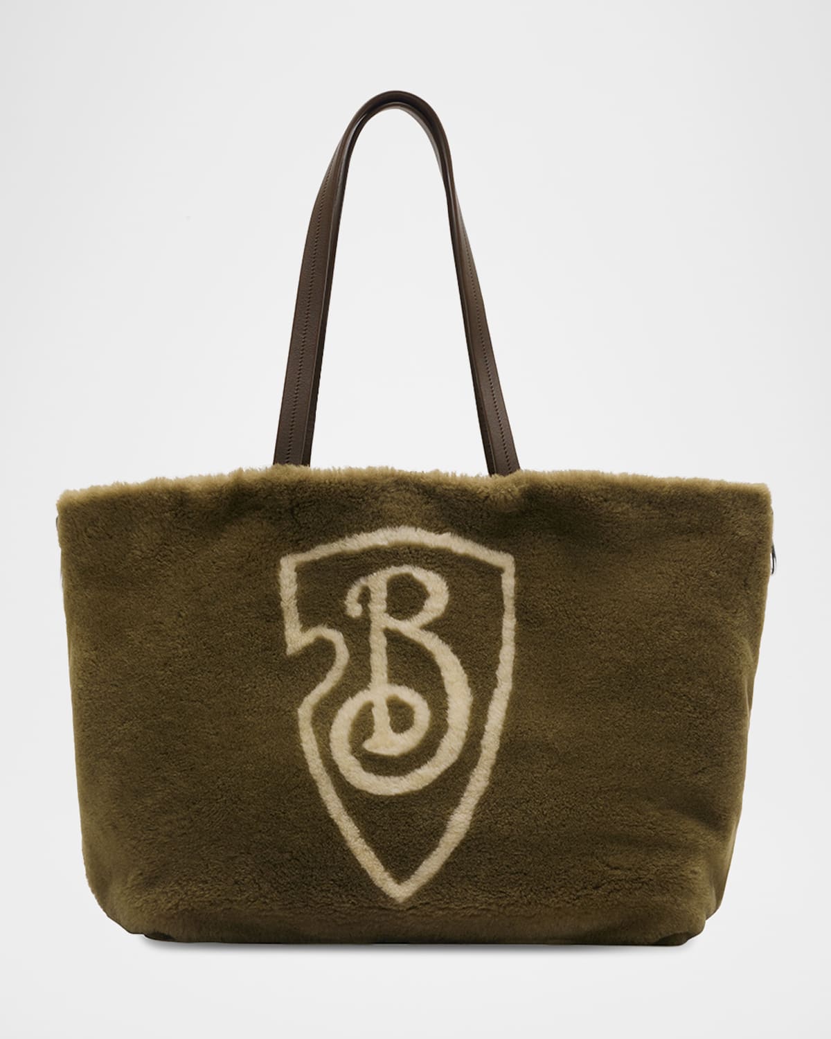 This Burberry tote bag is crafted from soft bleached/dyed shearling (Italy) with a contrasting B shield motif Flat leather shoulder straps Side zip closure Interior, one zip pocket Burberry check cottonblend lining Trim: Leather Approx. 14.6"H x 15"W x 8.7"D Made in Italy Dust bag included