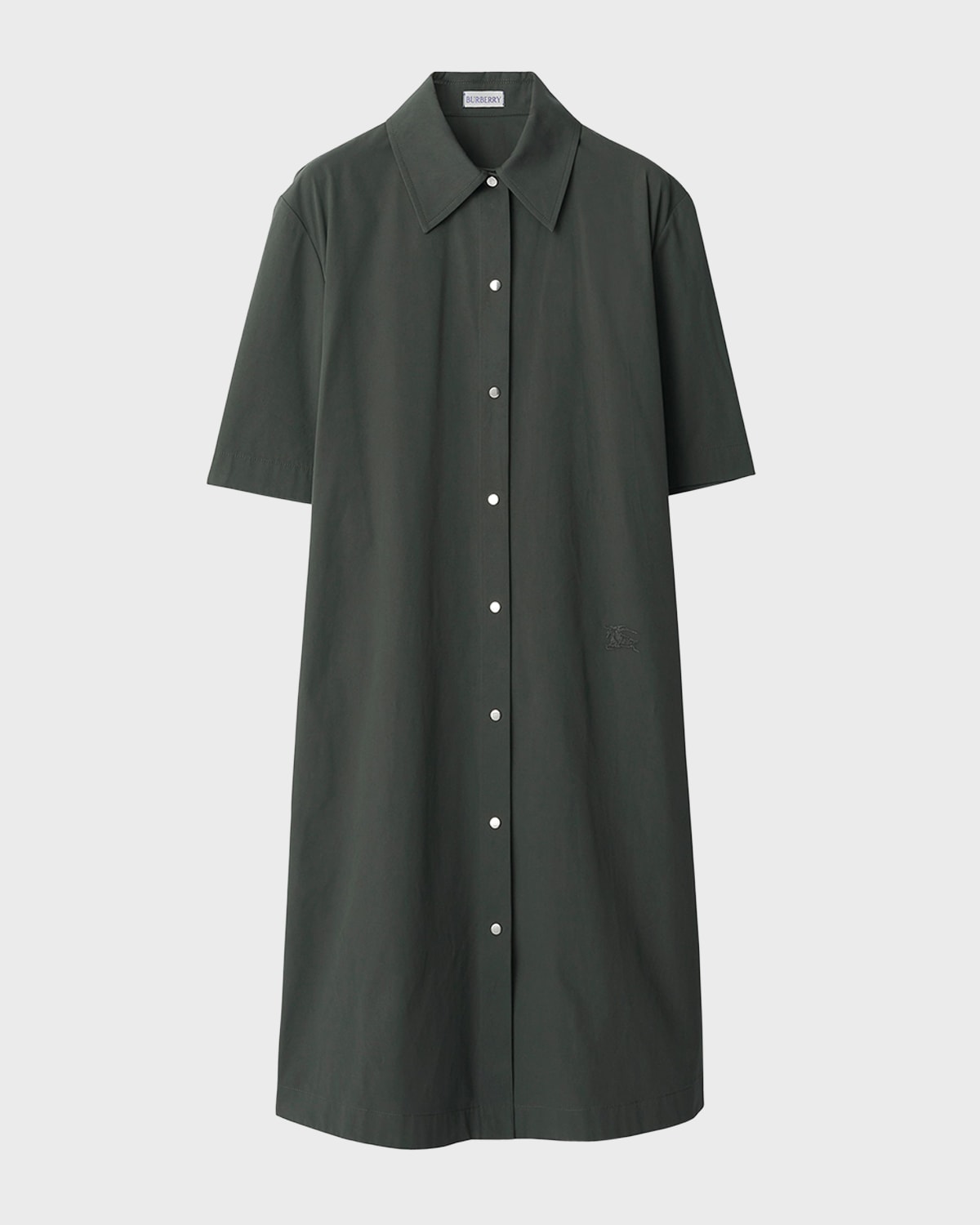 Burberry shirtdress featuring snaptab back strap Point collar; snap front Short sleeves Knee length Shift silhouette Cotton/viscose/polyester Made in Italy