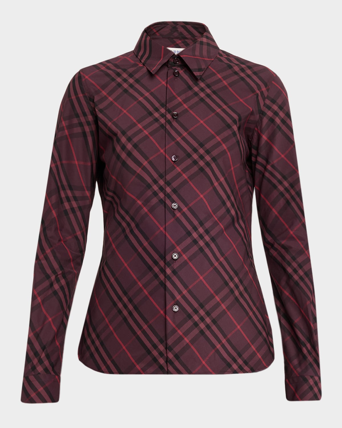 Burberry "Simone" shirt adorned with a signature check print Point collar; button front Long sleeves; button cuffs Relaxed fit Yoked back Shirttail hem Cotton Dry clean Imported
