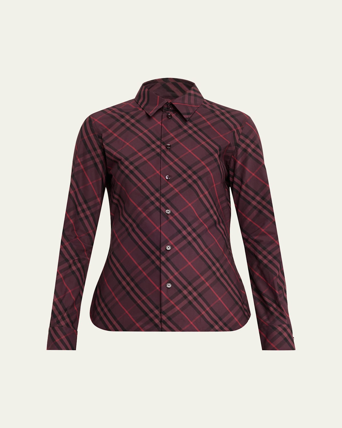 Burberry "Simone" shirt adorned with a signature check print Point collar; button front Long sleeves; button cuffs Relaxed fit Yoked back Shirttail hem Cotton Dry clean Imported