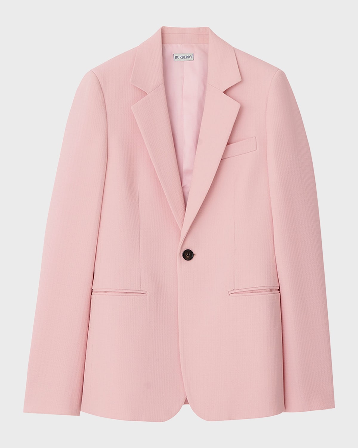 Burberry slimfit blazer jacket in wool Notched lapel collar Single button front Long sleeves Front welt pockets Midlength Wool Lining: Viscose Dry clean, professional cleaning recommended Made in Italy