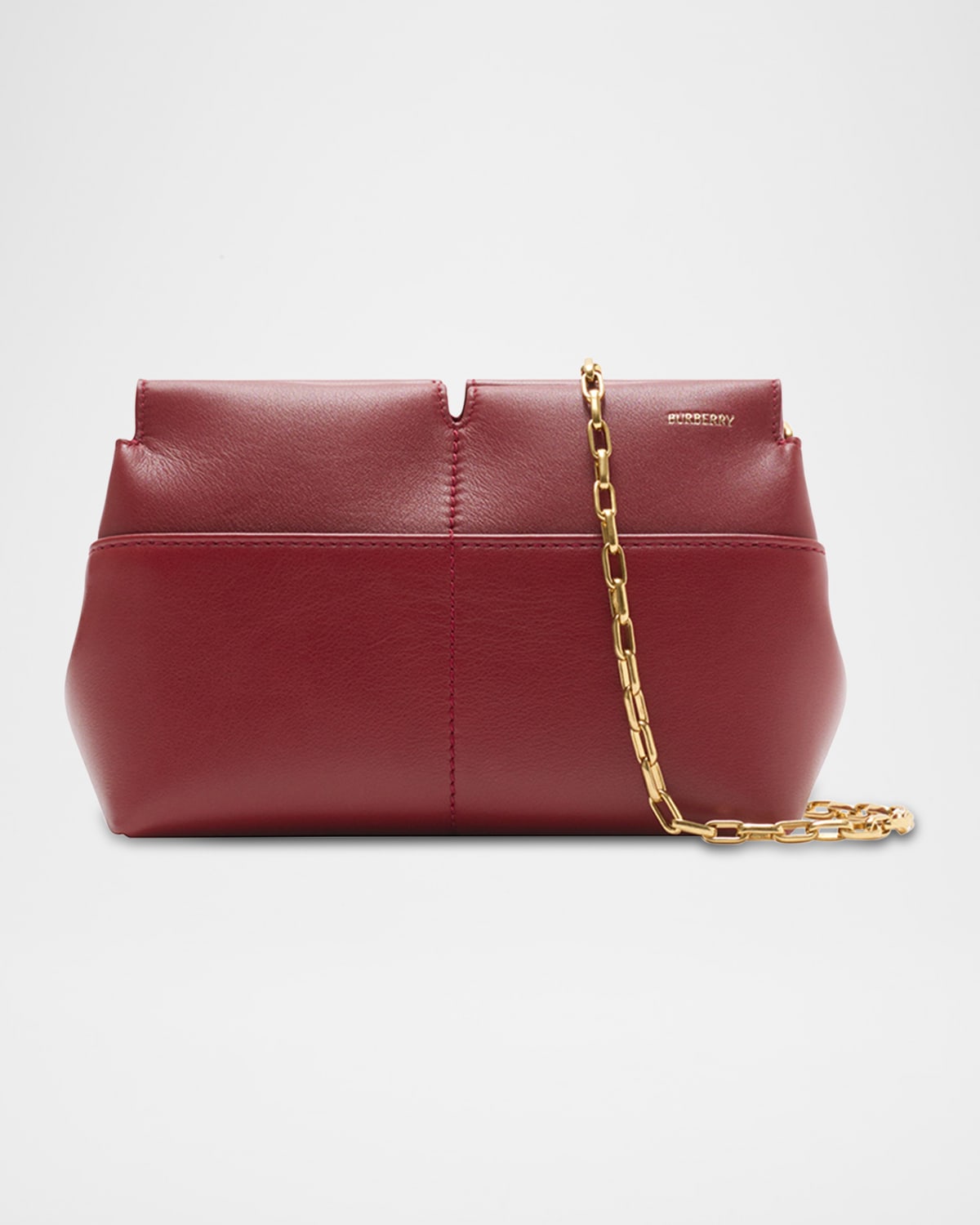 Burberry "Snip" clutch bag in smooth calf leather with embossed equestrian knight design accent Mirroring the shape of the bcut hardware, the versatile style features geometric topstitching Chain shoulder strap Can be worn as a clutch or shoulder bag Structured top with magnetic closure Exterior, slip pocket with magnetic closure Interior, slip pocket Handpainted edges Brushed metal hardware Printed burberry lettering at back Lining: embossed check leather Approx. 6.1"H x 7.9"W x 3.9"D Made in Italy