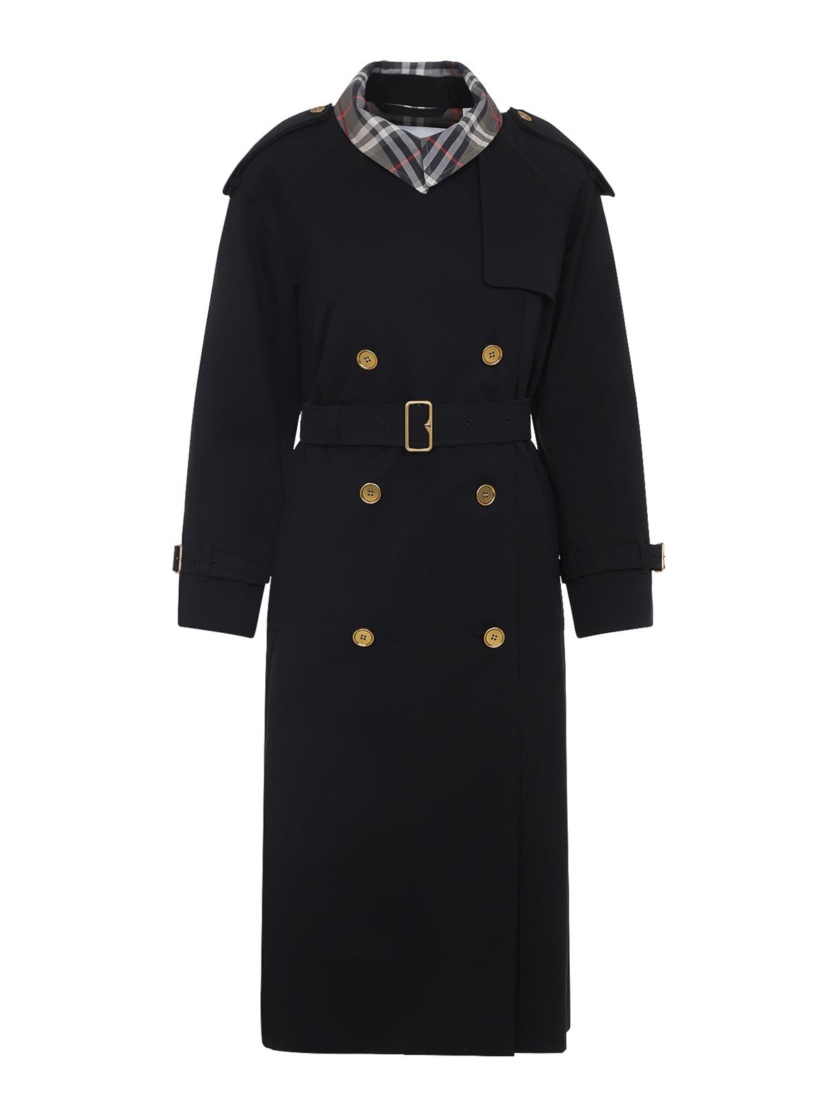 Trench noir Burberry Castelford confectionné en gabardine noire à carreaux sur les revers pointus, construction à double boutonnage, poignets boutonnés, ceinture ton sur ton avec boucle, poches latérales, bouton, languette aux épaules, manches longues avec poignets ceinturés, fente centrale dans le dos