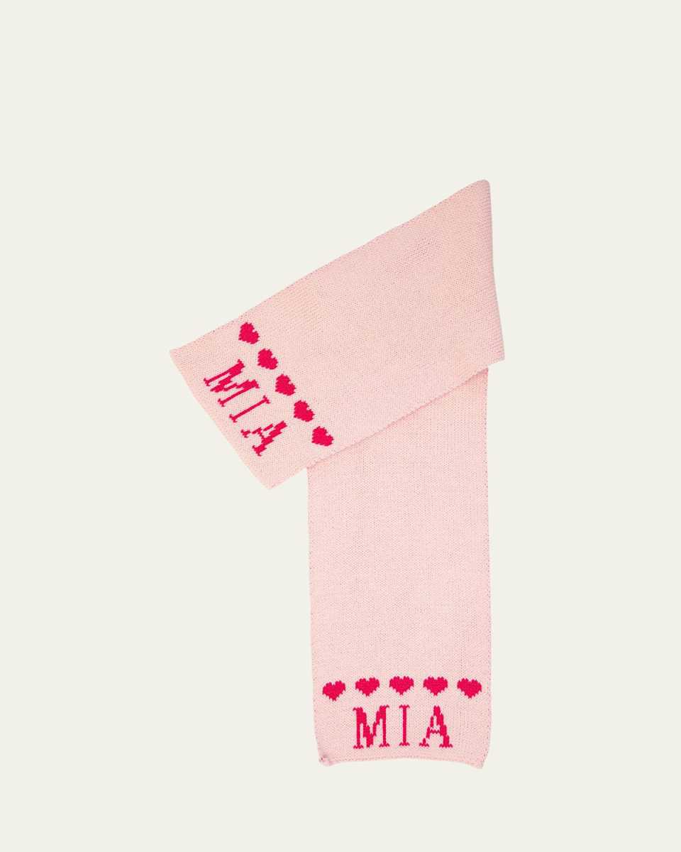 Butterscotch Blankees string of hearts scarf. One line of personalization in style shown. Acrylic. Made in USA of imported material.