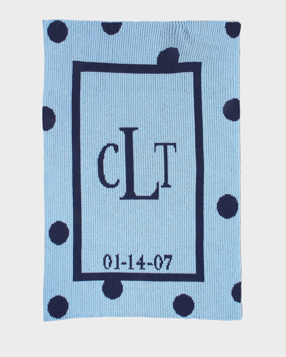 Light blue knit with dark blue polka dots. May be personalized with initials and date of birth in style shown. Acrylic. Machine washable. Handcrafted in USA.