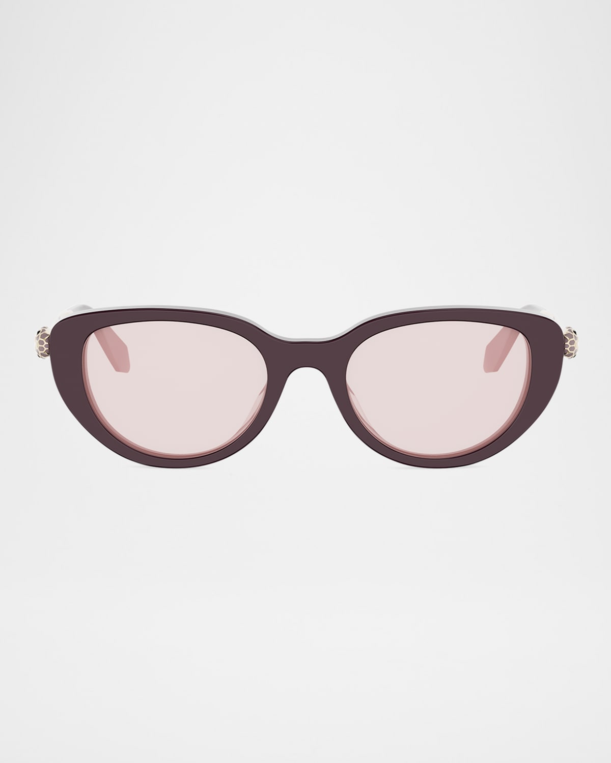 BVLGARI "Serpenti Forever" oval sunglasses in twotone acetate with signature snakehead accent hinges Lasered logo on metal temples and lens Lens/bridge/temple (in mm): 5019140 Solid lenses Saddle nose bridge Thin, tapered arms Capped earpieces 100% UVA/UVB protection Made in Italy