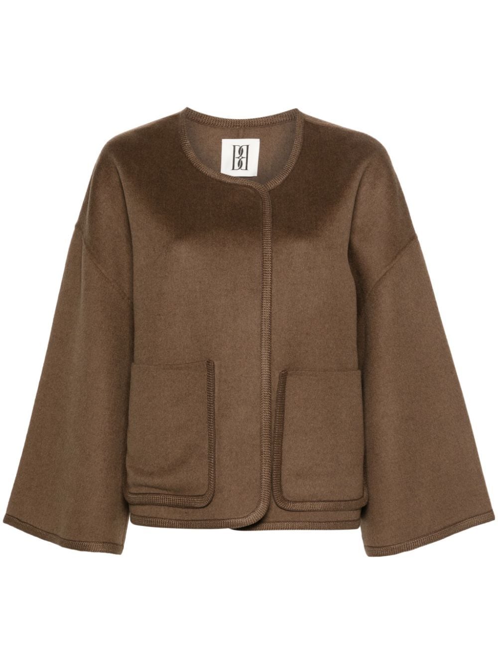shitake brown wool brushed effect interwoven trim round neck drop shoulder long sleeves two front patch pockets open front curved hem unlined