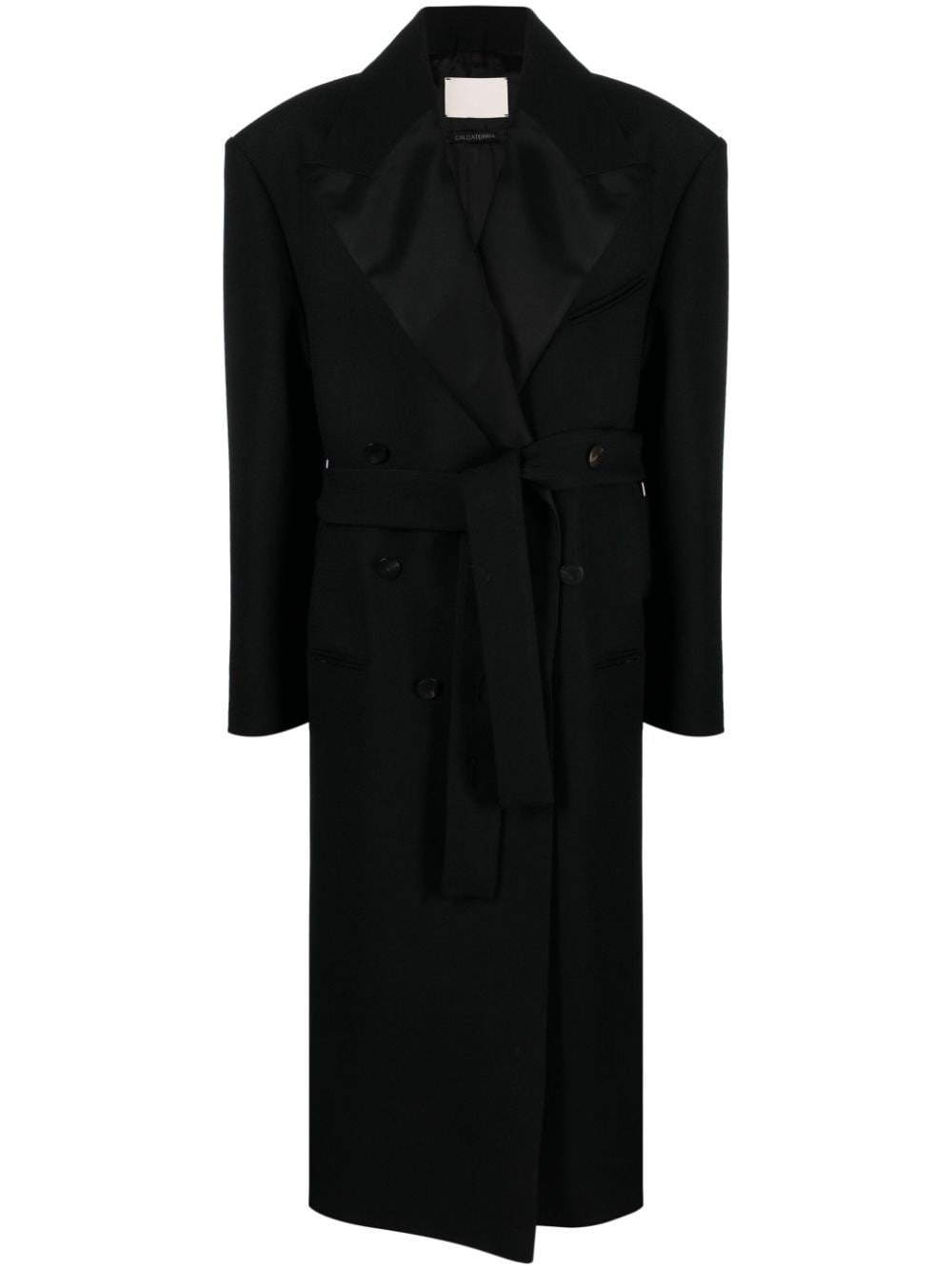 black virgin wool satin trim peak lapels double-breasted button fastening padded shoulder drop shoulder long sleeves buttoned cuffs detachable and adjustable waist belt jetted chest pocket two front jetted pockets central rear vent straight hem