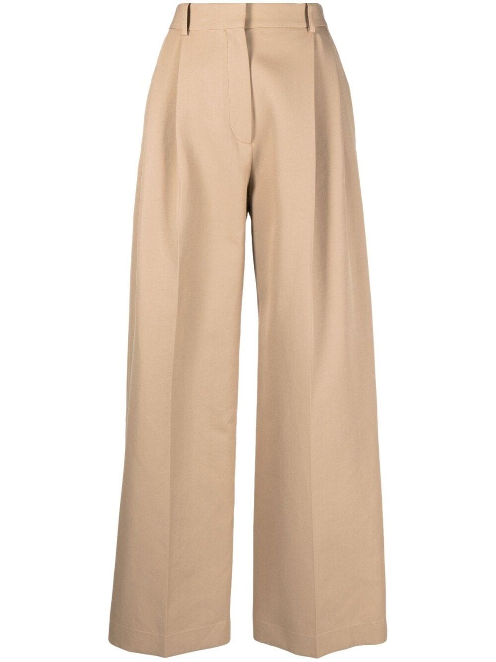 camel brown silk-cotton blend wide leg pleat detailing belt loops concealed front fastening two side inset pockets two rear welt pockets