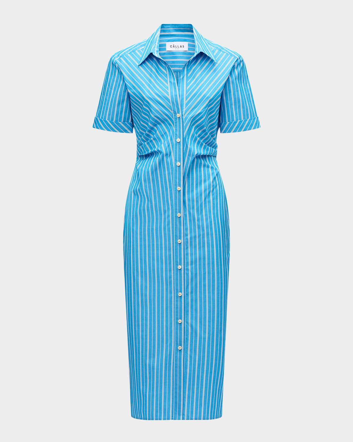 CALLAS Milano "Lou" striped midi shirtdress in cotton is finished with cinching pleats on the waist Spread collar; button front Short sleeves Back yoke Hem falls below the knee Column silhouette Cotton Dry clean Made in Italy