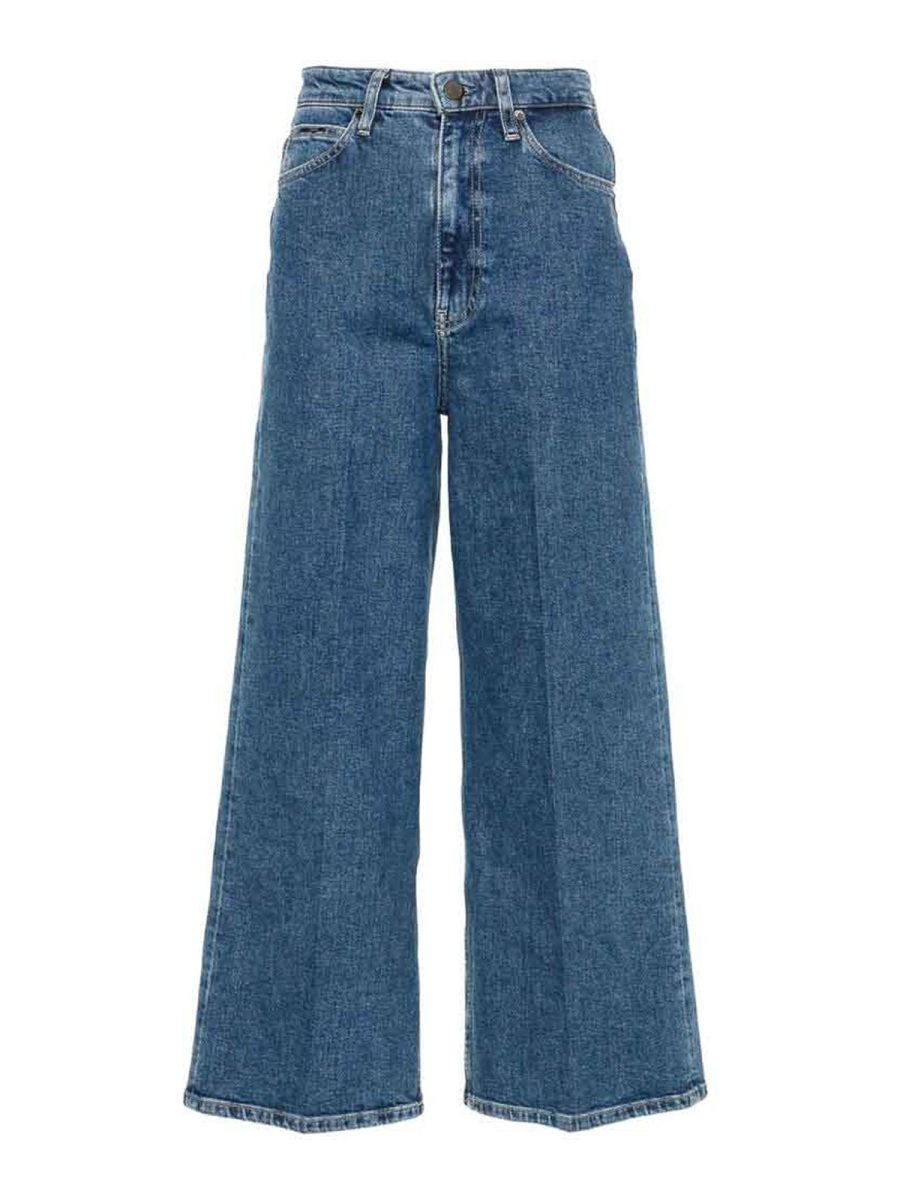 Denim bleu mélangé, plaque logo ton sur ton, écusson logo à l'arrière, haut, passants de ceinture, braguette et bouton dissimulés, cinq poches classiques, jambe large, jambe raccourcie
