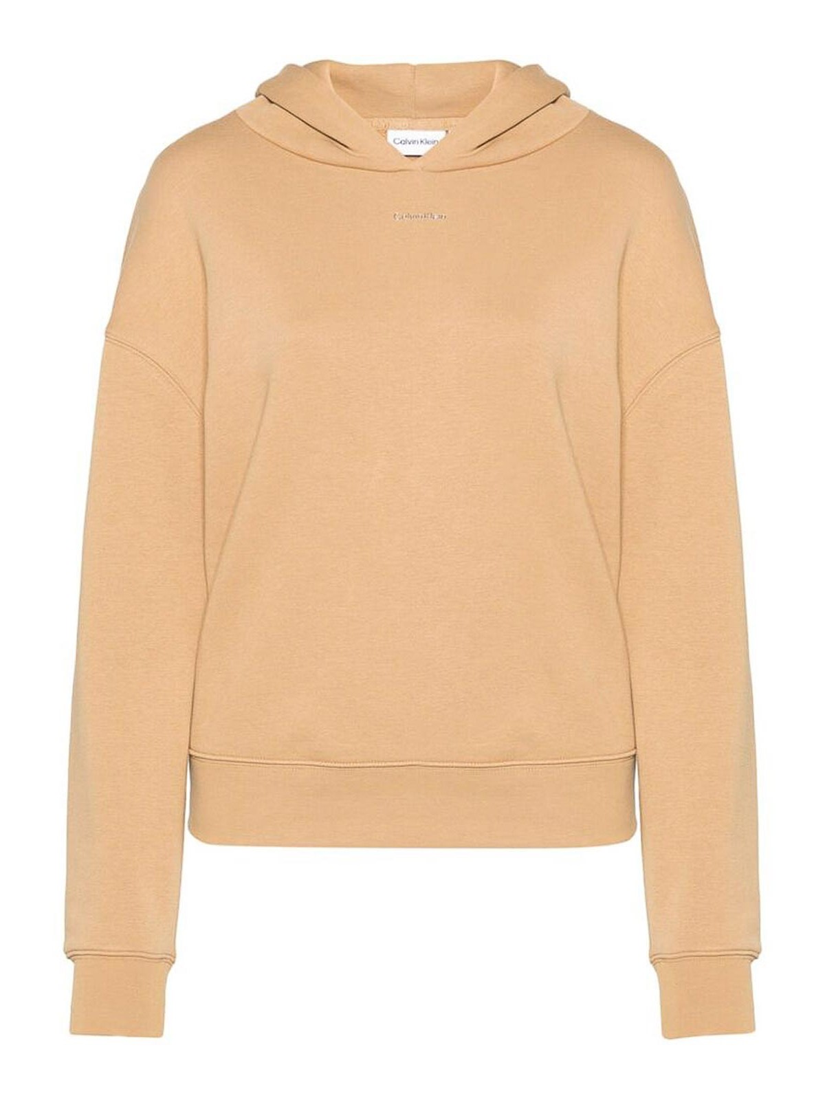 Tissu beige glacé, texture mélangée, capuche souple, épaules, manches longues, logo imprimé sur les poignets et l'ourlet côtelés