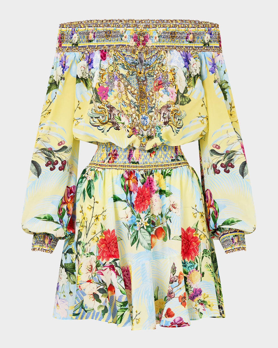 Camilla lovingly handcrafted nonsheer dress in an elegant Flor Fantastica print finished with crystal embellishments Shirred offtheshoulder neckline Long blouson sleeves; smocked cuffs Smocked waistband Hem falls above the knee Softly gathered skirt Slipover style Silk Dry clean Imported