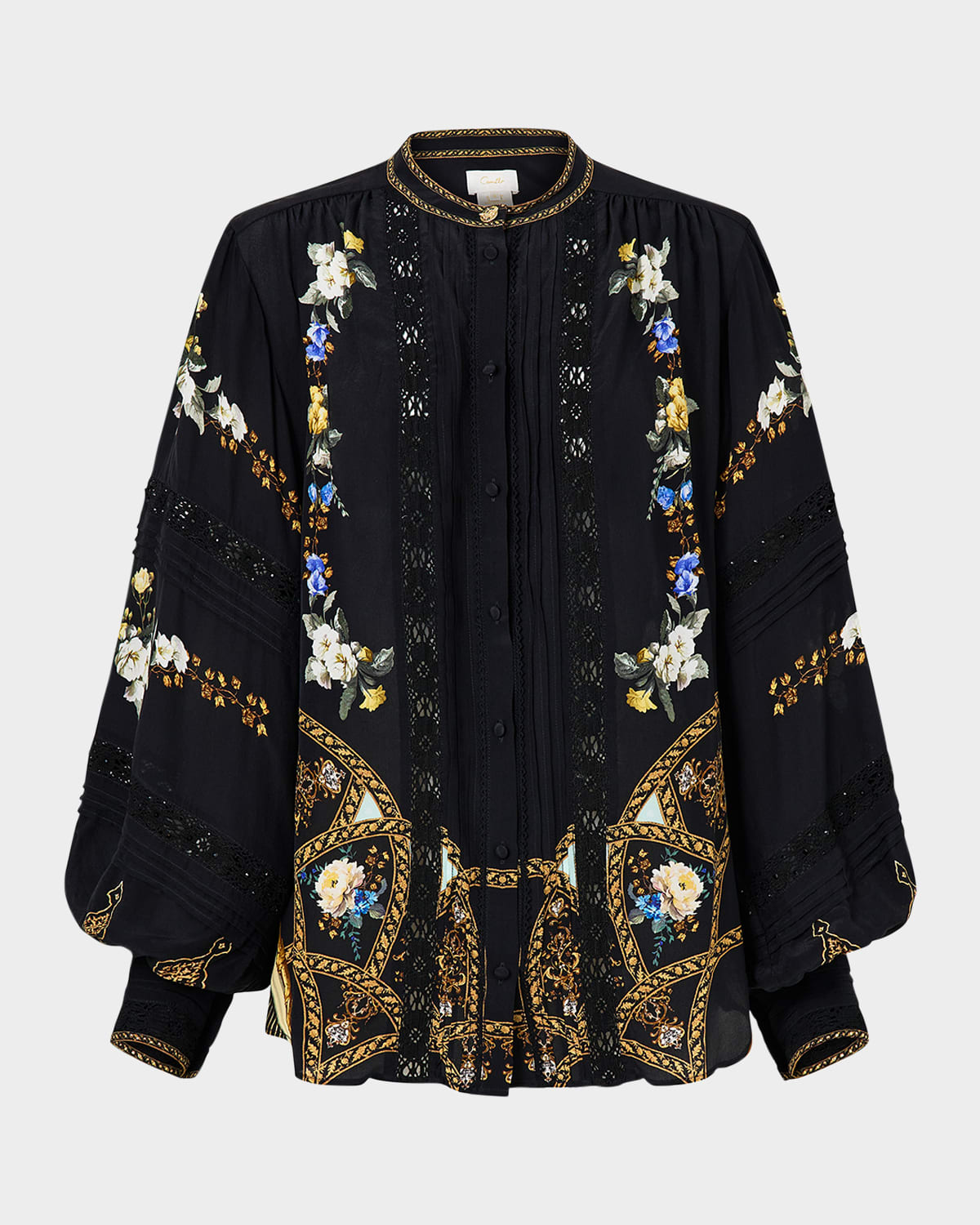 Camilla boldlyprinted blouse accented with lace insets, pleating and crystal embellishments Band collar; button front Long blouson sleeves; wide button cuffs Yoked back Relaxed fit Hip length Silk Dry clean Imported