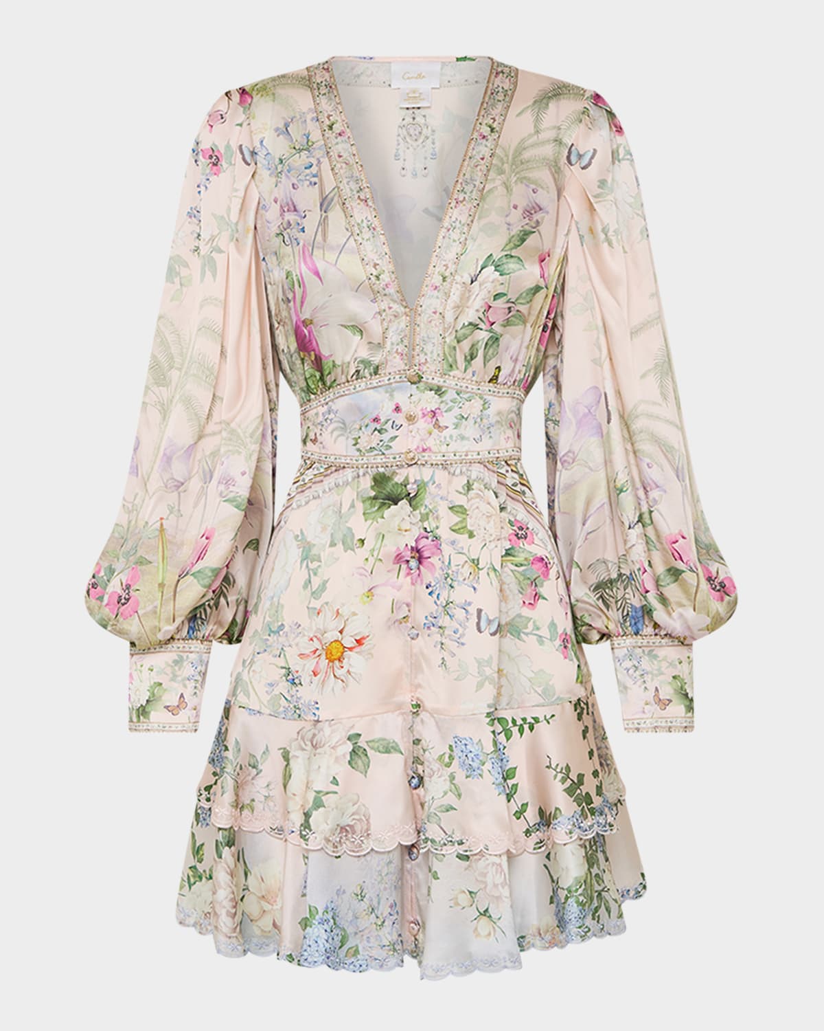 Camilla lovingly handcrafted shirtdress in Palacio Playground print with crystal embellishments V neckline Long blouson sleeves; button cuffs Elasticated back waistband Double ruffle hem falls above the knee Aline silhouette Button front closure Silk Imported