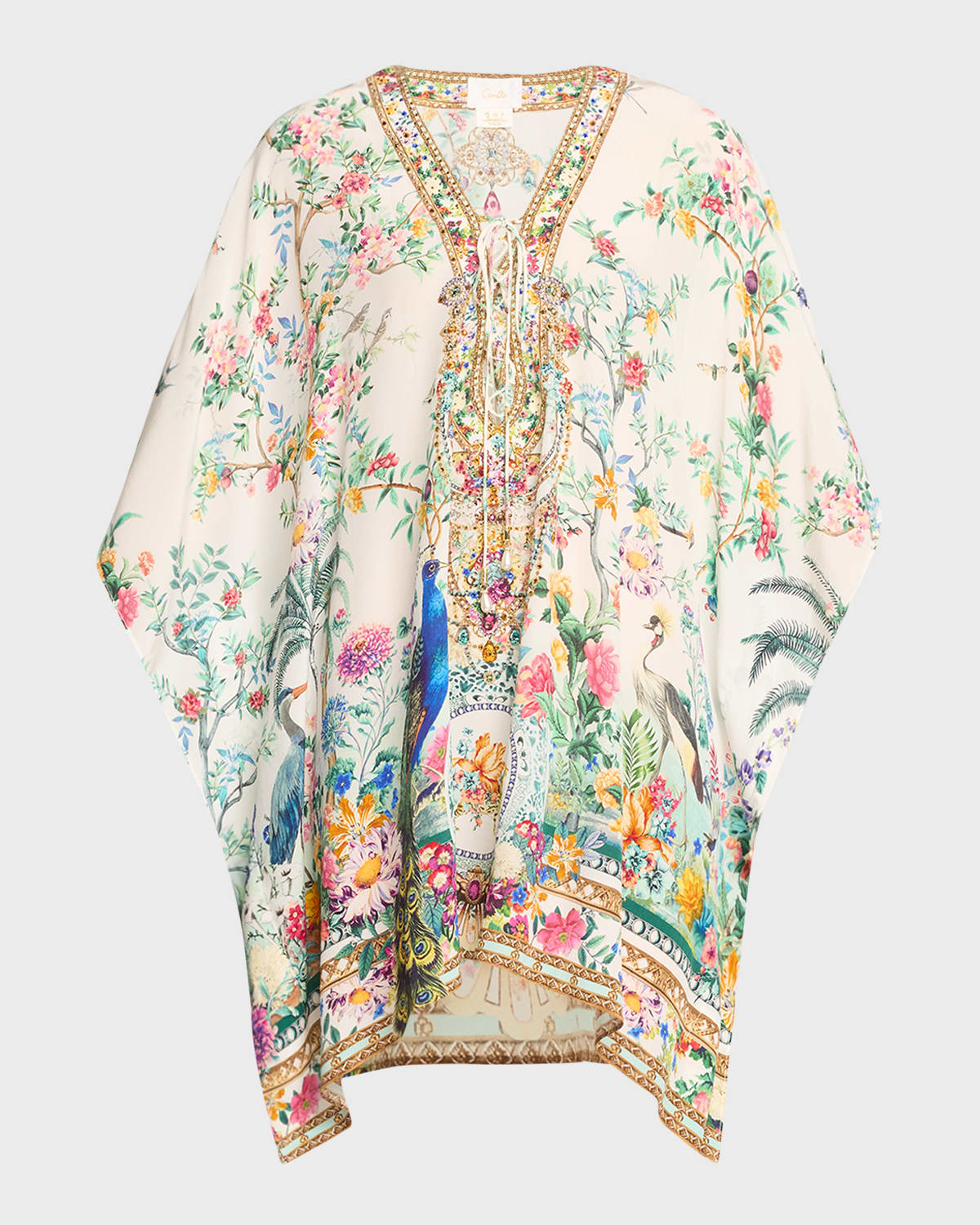 Camilla crystalembellished silk crepe kaftan in Plumes and Parterres delicate floral print V neckline Laceup front with tassel ends Relaxed 3/4 sleeves Handkerchief hem falls above the knee Slipover style Silk Dry clean Imported