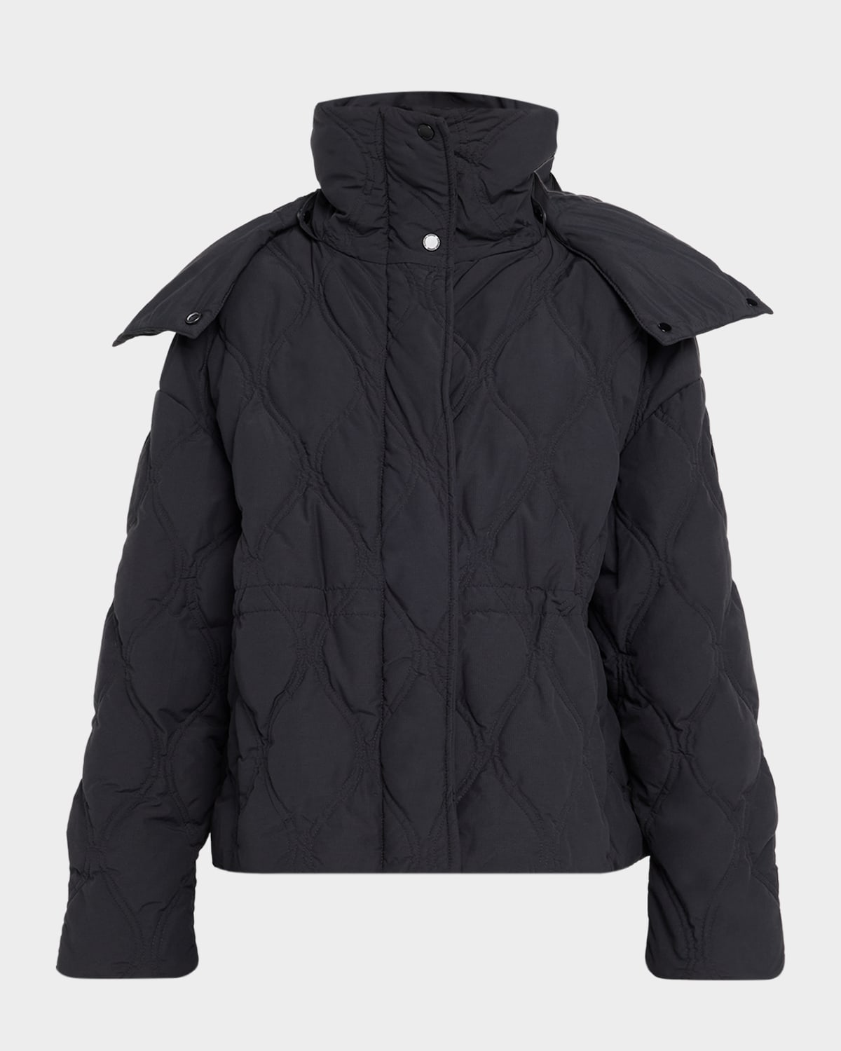 The "Alessia" quilted downfilled jacket by Canada Goose is a winterweather essential that features interior straps for handsfree carrying and a snapoff hood for versatile styling. Stand collar Long sleeves Signature tonal logo patch on the left sleeve Side zip pockets Internal drawcord waist for adjustable fit Classic fit Hem sits at the hip Zipfront with snap placket Cotton/nylon/polyamide Fill: Down/feather Lining: Nylon Machine wash cold, inside out; do not iron Made in Canada