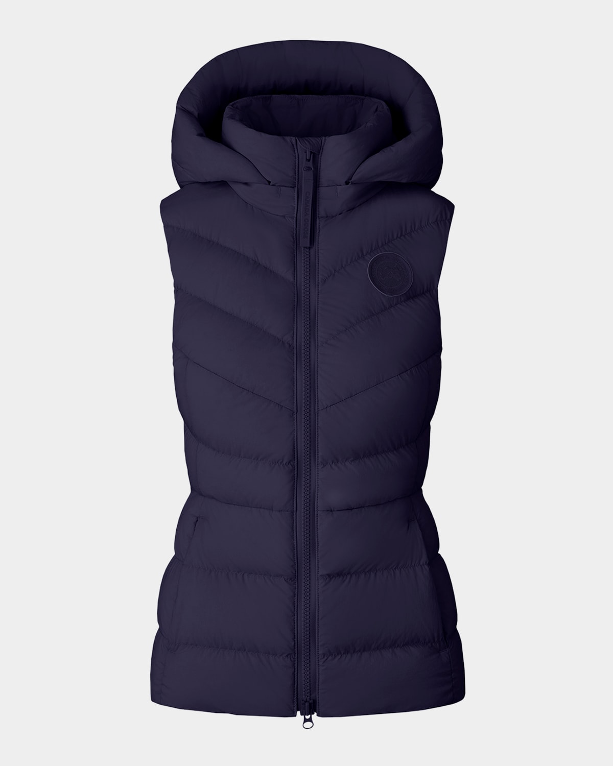 Crafted in twoway stretch Aira fabric with a matte finish, the "Clair" down vest by Canada Goose features contour quilting to hug your body without compromising warmth. Cold weather protection down to 5°F. Interior backpack straps for handsfree carrying Adjustable hooded neckline; twoway zipfront Sleeveless Signature logo patch on the chest Side fleecelined zip pockets Fitandflare silhouette Hem sits at the hip Nylon/polyamide/spandex Fill: Down/feather Lining: Nylon Machine wash cold, inside out Made in Canada