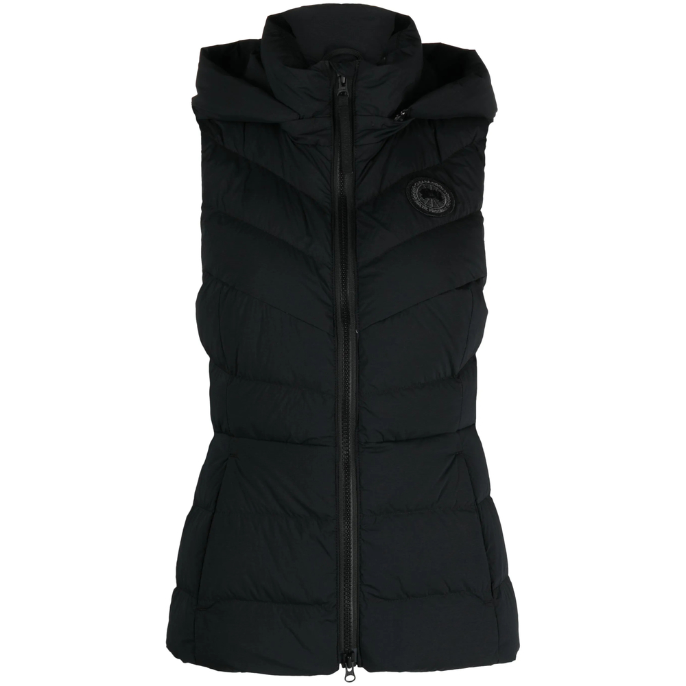 black feather down padded design matte finish water-repellent wind-resistant chevron quilting logo patch at the chest high neck detachable hood front zip fastening sleeveless front zip fastening pockets straight hem internal zip-fastening pocket
