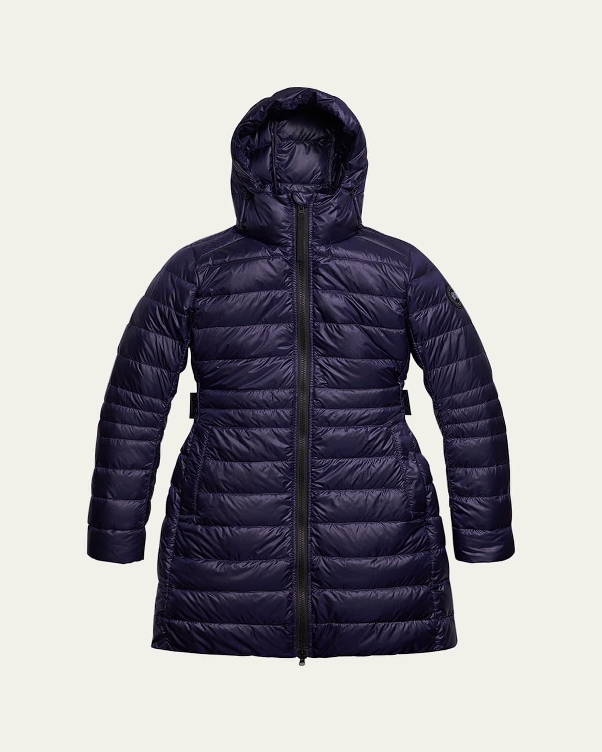 Canada Goose "Cypress" lightweight channelquilt jacket Hooded collar; twoway zipper Long sleeves; black disc at left arm Packable into the interior left pocket Exterior loops provide backpack straps for handsfree carry Pockets at sides Aboveknee length Recycled nylon Lining: recycled nylon Fill: down Made in Canada