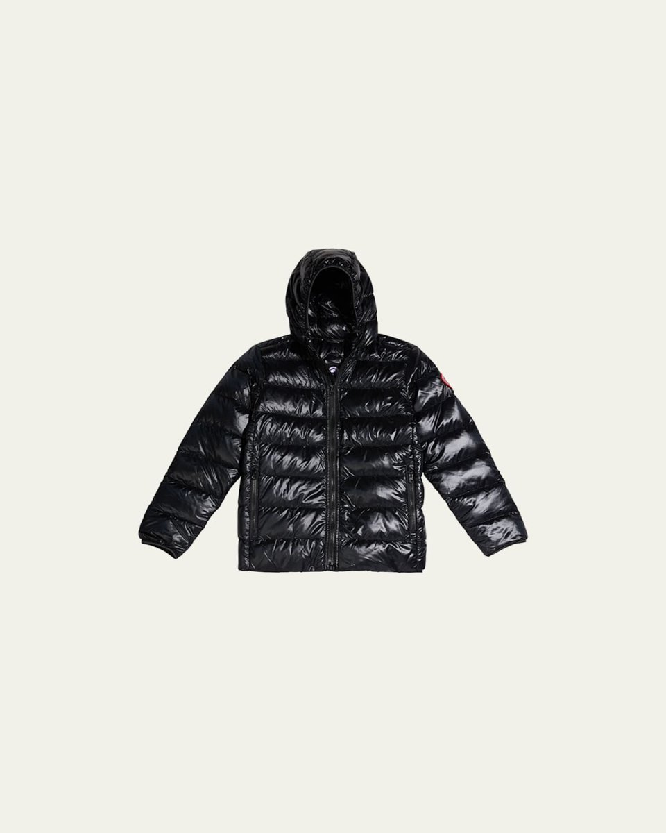 Canada Goose youth "Crofton" quilted jacket with signature logo patch at sleeve Hooded collar; fullzip front Long sleeves Side zip pockets Recycled nylon Down fill Made in Canada