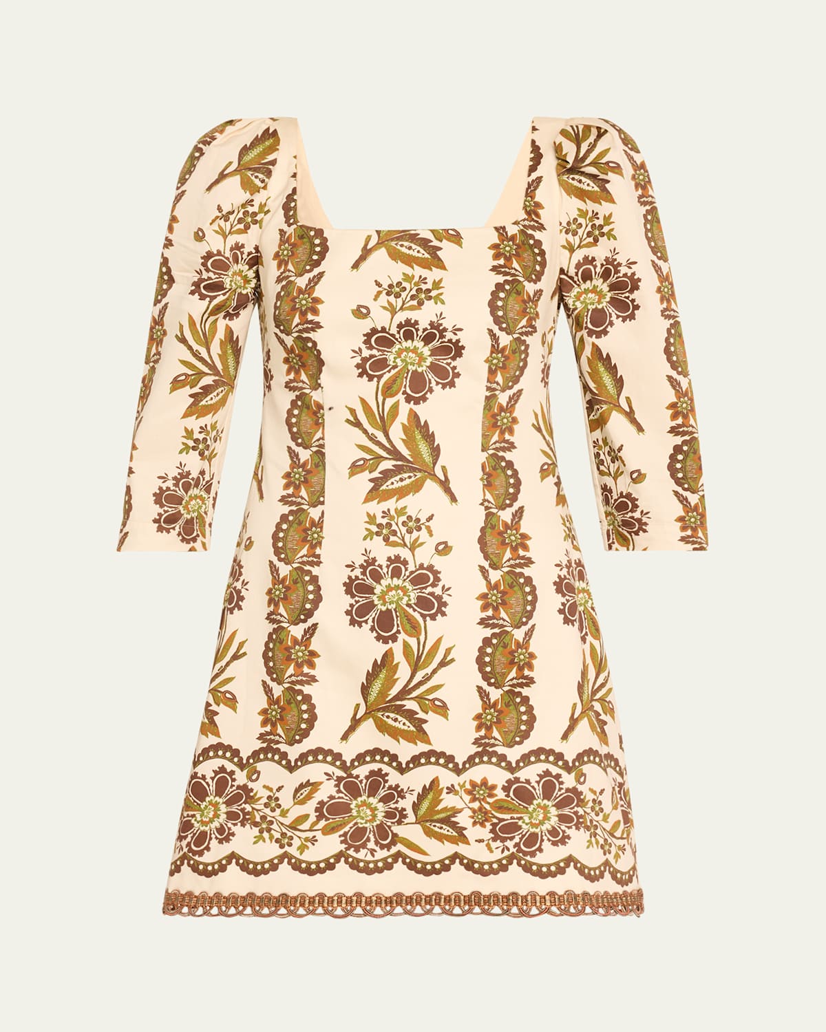 Cara Cara "Belinda" slimfit mini dress decorated in vintageinspired floral print Square neckline Threequarter sleeves Bra loop on internal shoulder seam Tailored with bust and waist darts Hem hits above the knee Sheath silhouette Invisible back zip closure Cotton/spandex Dry clean only or hand wash cold Imported