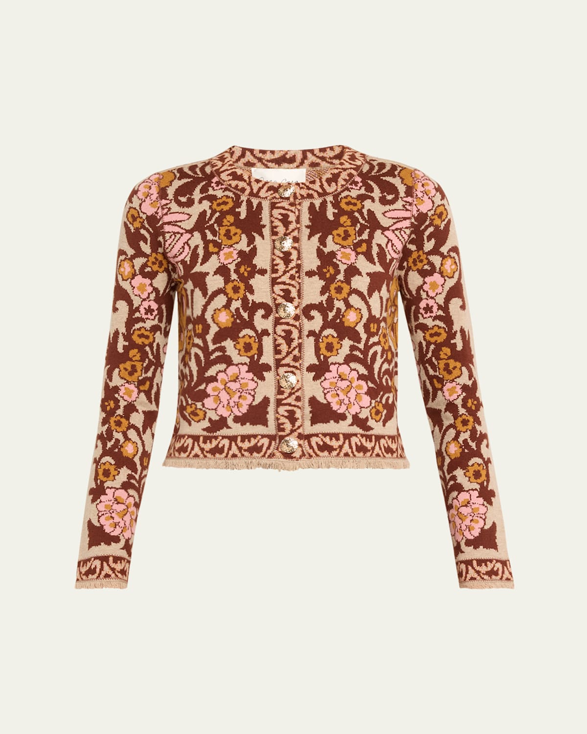 Cara Cara "Livi" jacquard jacket features goldtone buttons and a woven motif with contrast border trim Round neckline Long sleeves Button placket Slim fit Fringe trim Wool/cotton Unlined Dry clean Imported