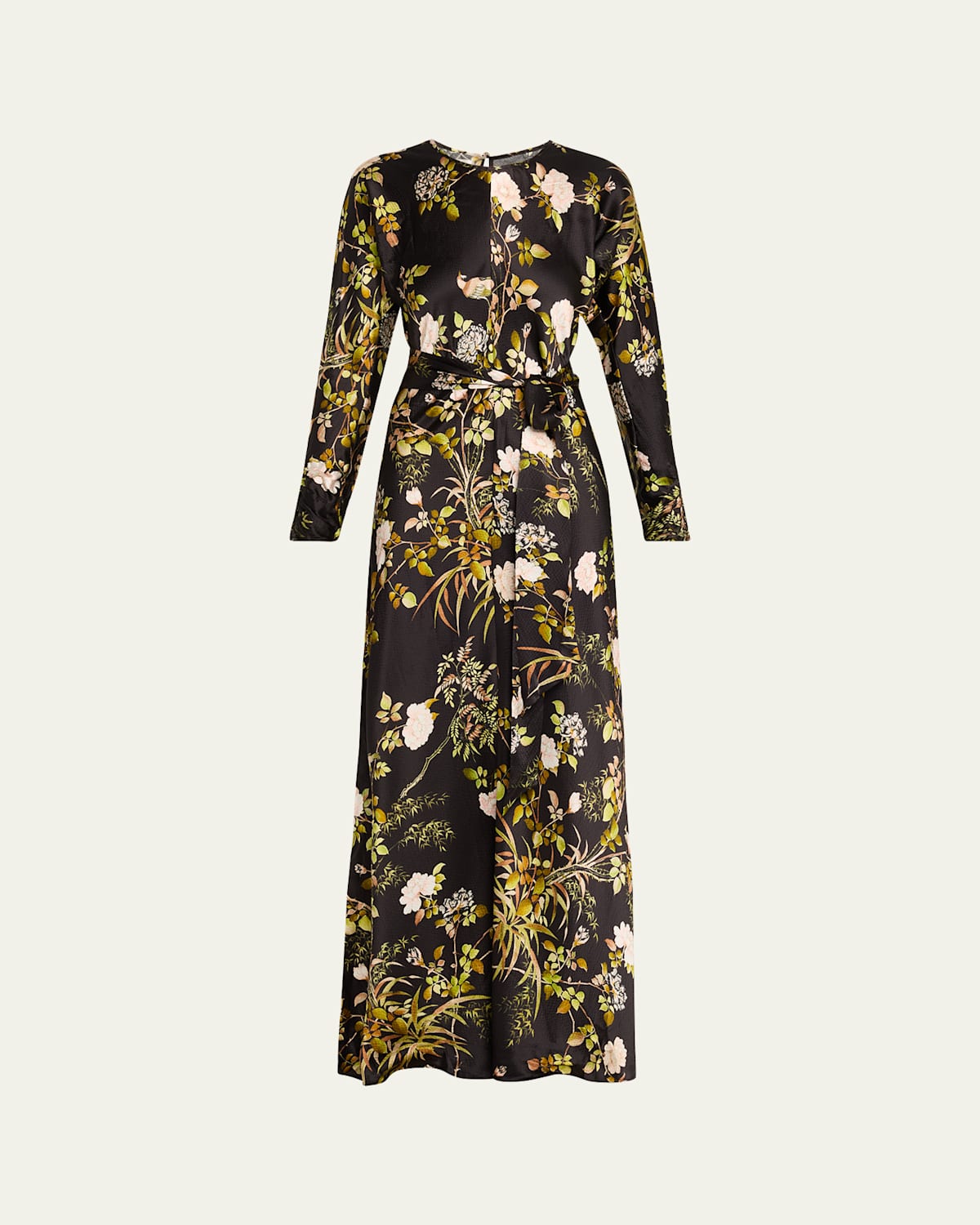 Crafted of biascut hammered silk, the Cara Cara "Montgomery" dress features an allover floral print and side seam slits Crew neckline Long shirred sleeves Selftie sash Full length Aline silhouette Button/keyhole back Silk Dry clean Imported