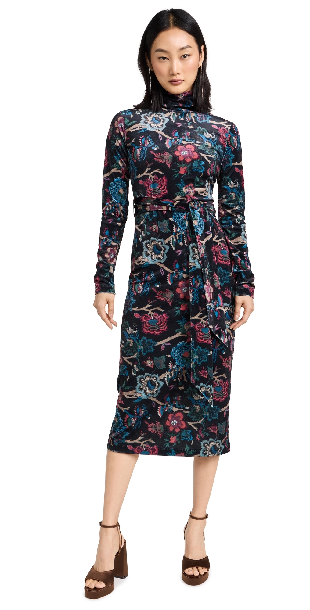 Fabric: Mid-weight, stretch velour. Paisley floral print. Turtleneck and long sleeves. Tie self-belt. Shell: 95% polyester/5% spandex. Unlined. Dry clean or wash cold. Made in the USA. Measurements: Measurements from size XS Length: 46in / 117.0cm, from shoulder