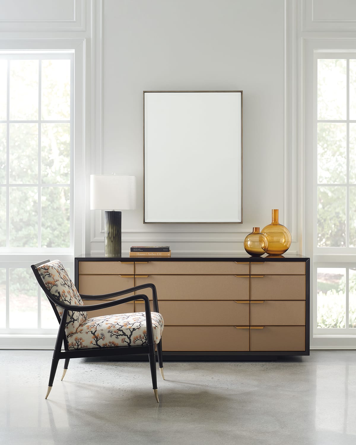 Handcrafted dresser merges minimalism with elements of midcentury modern style Each drawer front is wrapped in a beautifully textured vinyl with a rivulet pattern Offers generous storage with softclosing features and two feltlined top drawers Top drawers with side guides and the rest of the drawers with undermount soft close guides Made of dark chocolate Birchwood and polyester Overall, 72"W x 19"D x 32"T Includes hanging hardware Assembly required Imported Boxed weight, approximately 285.0lbs
