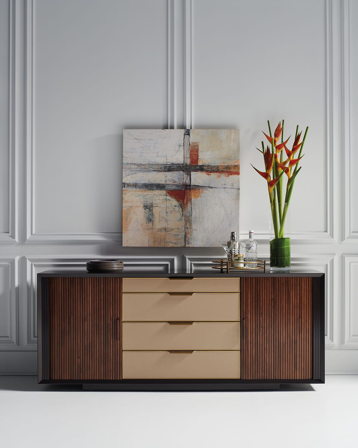 Handcrafted drawer in dark chocolate with champagne gold metal trim Tambour doors with two fixed shelves on left side Five undermount soft close drawers on right side Made of birch wood, maple, and walnut Overall, 78"W x 21"D x 32"T Imported Boxed weight, approximately 325.0lbs