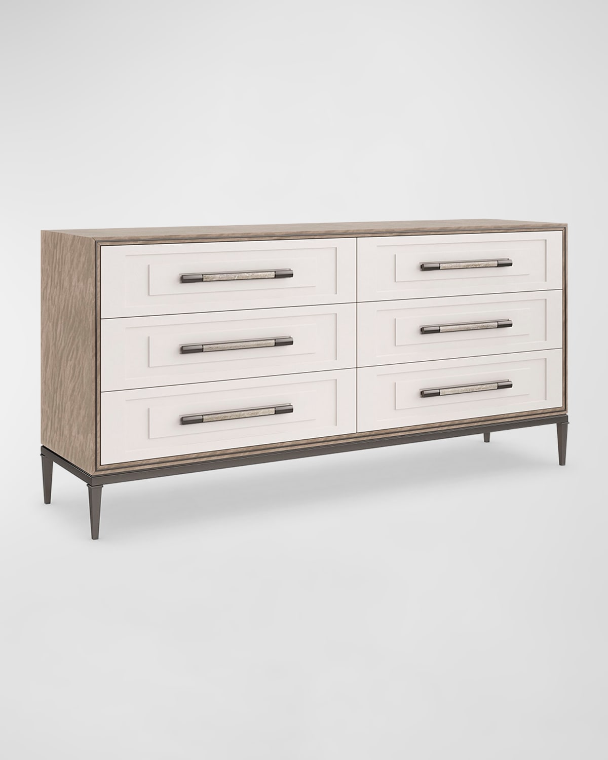 Designed with the utmost attention to detail and materials, this sophisticated dresser is wellsuited for a casual retreat or a stately bedchamber. Stepped drawer fronts in a pearly white finish create subtle shadow and dimension, called to attention by jewelrylike custom hardware with a ceramic inlay. Six spacious drawers are framed in deep bronze metal trim and encased in silver curupixa veneers, finished in mountain smoke to highlight its luxurious, figured wood grain. Handcrafted of engineered hardwood, birch veneers, and steel Metal base and front frame molding in deep bronze finish Six drawers with undermount softclose guides Overall, approx. 72"W x 19"D x 35"T Includes hardware Weight, 322.0 lbs Imported Boxed weight, approximately 340.0 lbs