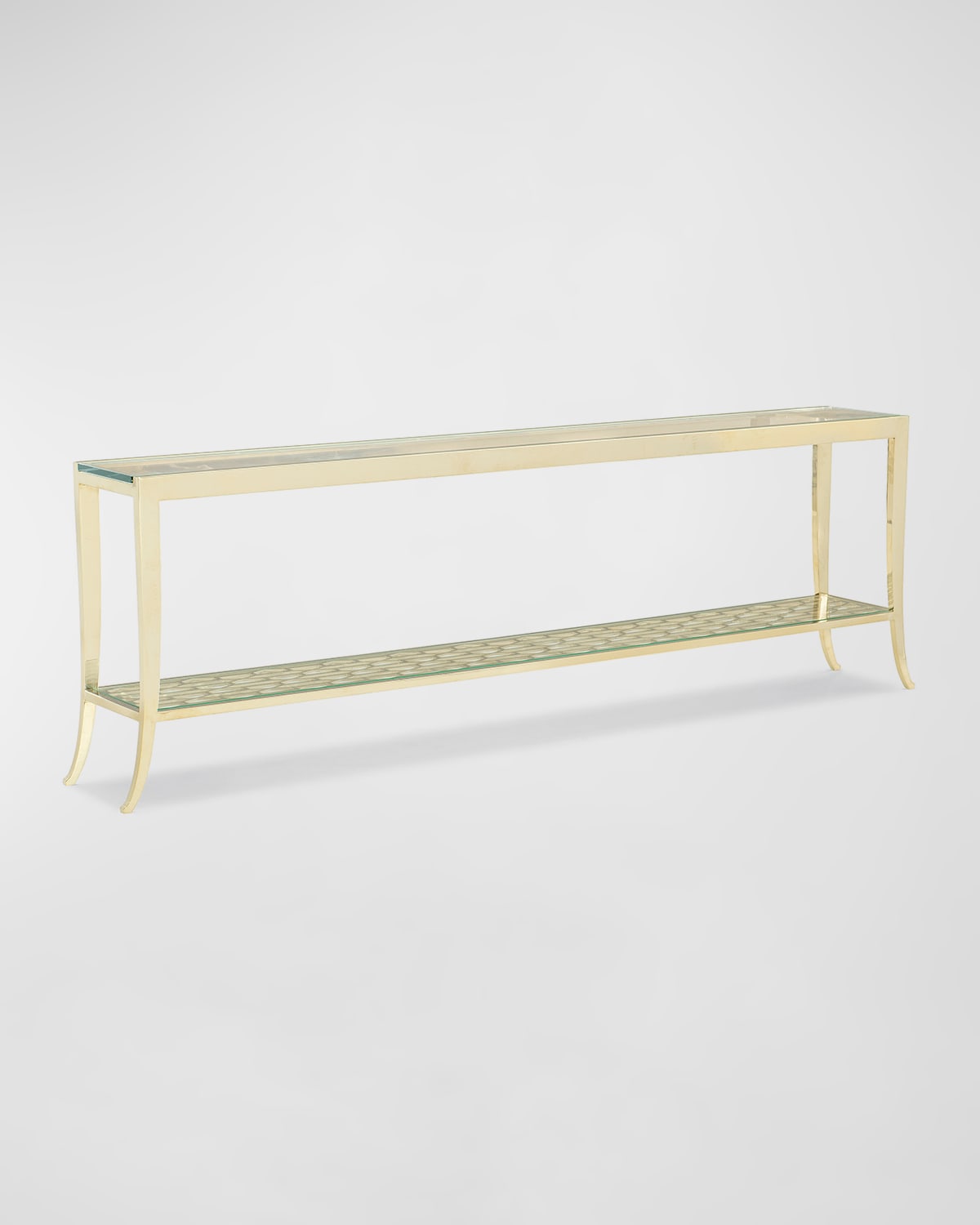 Perfect behind a sofa or in a long hallway, this console table is slim and modern. A stretcher of cut metal features an elongated contemporary honeycomb motif suspended between four graceful sabre metal legs - all bathed in highly polished Whisper of Gold. Paired with an ultraclear glass top with a waterfall effect at each end, use this piece to brighten any room. Handcrafted of metal and tempered glass Overall, approx. 82"W x 11.5"D x 26"T Top size, 78.5"W x 11.5"D Space above shelf, 16.625"T Space between shelf and floor, 6.75"T Includes hardware Weight, 45.0 lbs Imported Boxed weight, approximately 60.0 lbs