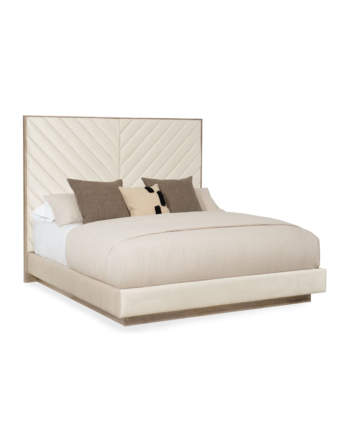 Handcrafted king bed features modern channel tufting design of converging angles that create a mesmerizing chevron pattern Fully upholstered headboard, footboard, and sidereal Wood trim around headboard and base in ash driftwood Made of hardwood solids, viscose, and cotton Adjustable slat roll bedding Hardware included Finished back Plint base Overall, approx. 84.25"W x 82"D x 67.75"T Imported Weight, 370.0lbs Boxed weight, approximately 400.0lbs