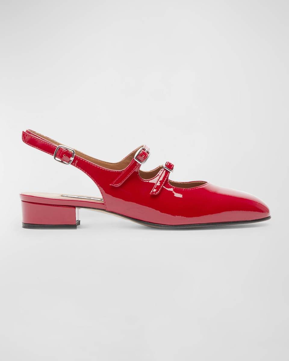 CAREL "Peche" patent calf leather ballerina flats 0.75 in / 20 mm flat heel Round toe Dual Mary Jane buckle straps Adjustable slingback strap Leather outsole Lining: Goat leather Made in Italy