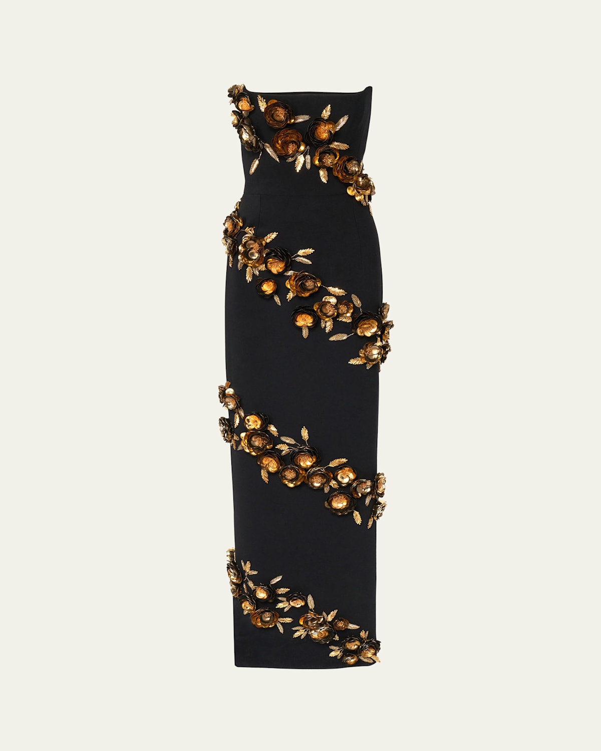 Carolina Herrera gown embellished with 3D metallic florals in a wraparound placement Strapless neckline Sleeveless Back vent Full length Column silhouette Invisible back zipper Polyester Dry clean Made in USA