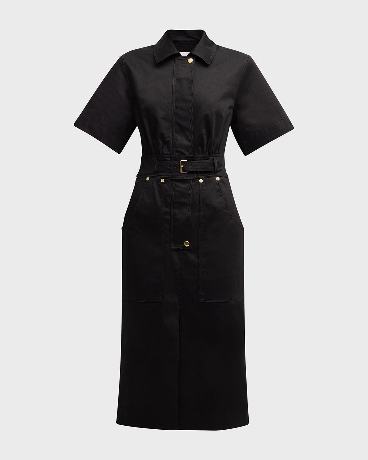 Carolina Herrera cargo dress with belted waist Spread collar; concealed halfbutton placket Short sleeves Back yoke Front slip pockets Sheath silhouette Midi length Front slit Cotton/elastane Dry clean Made in Italy
