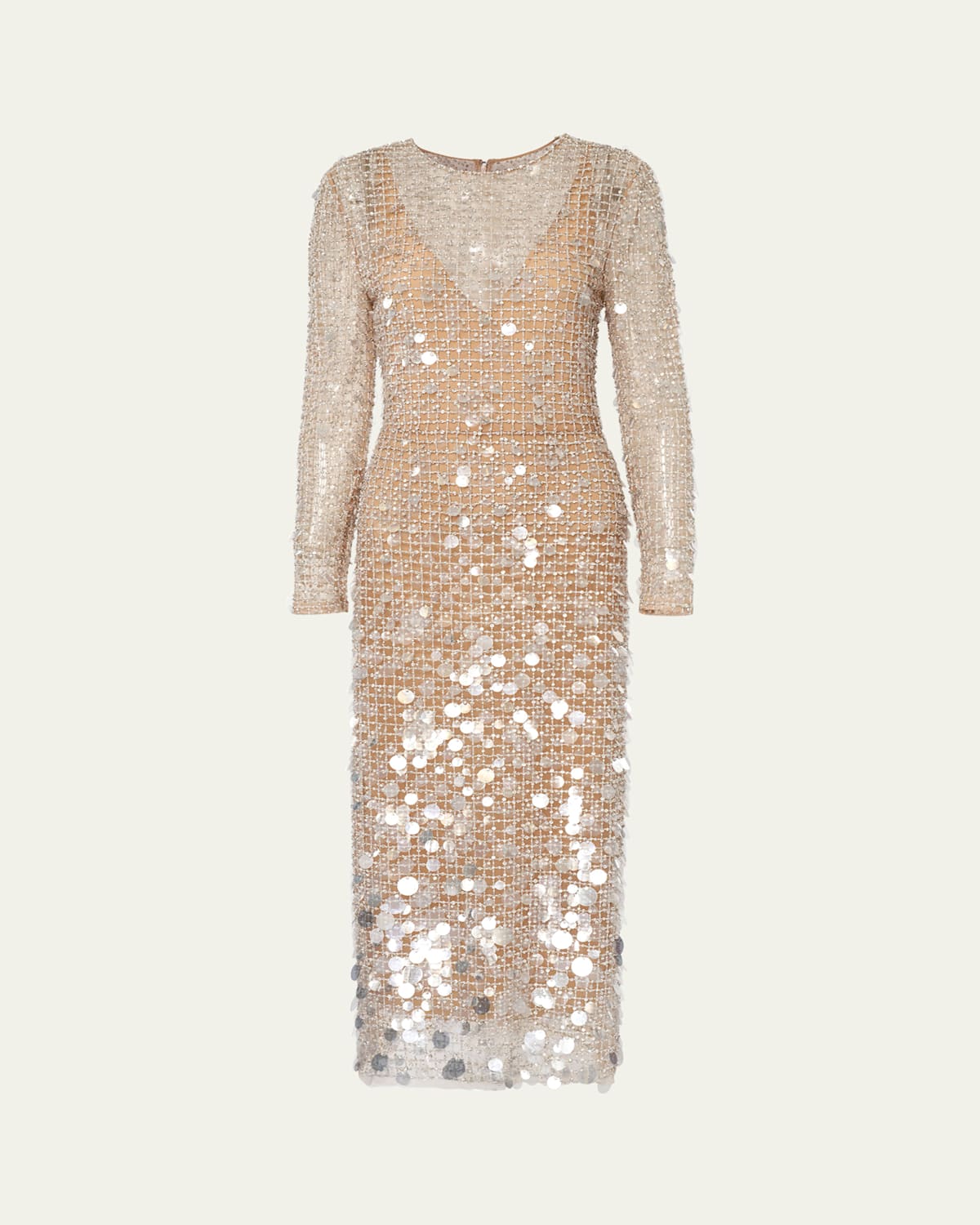 Carolina Herrera semisheer dress embellished with a gridwork pattern and paillette accents Crew neckline Long sleeves Belted waist Centercut back vent Hem falls below the knee Sheath silhouette Invisible back zipper Nylon/polyamide Dry clean Imported