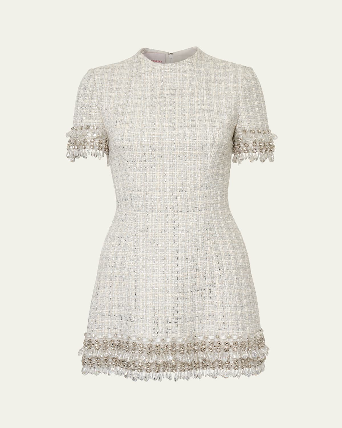 Carolina Herrera tweed dress complete with tonal beading and crystal embellishments along the cuffs and hem Mock neckline Short sleeves Hem falls above the knee Shift silhouette Center back zipper Nylon/polyamide/polyester/cotton Dry clean Made in Italy