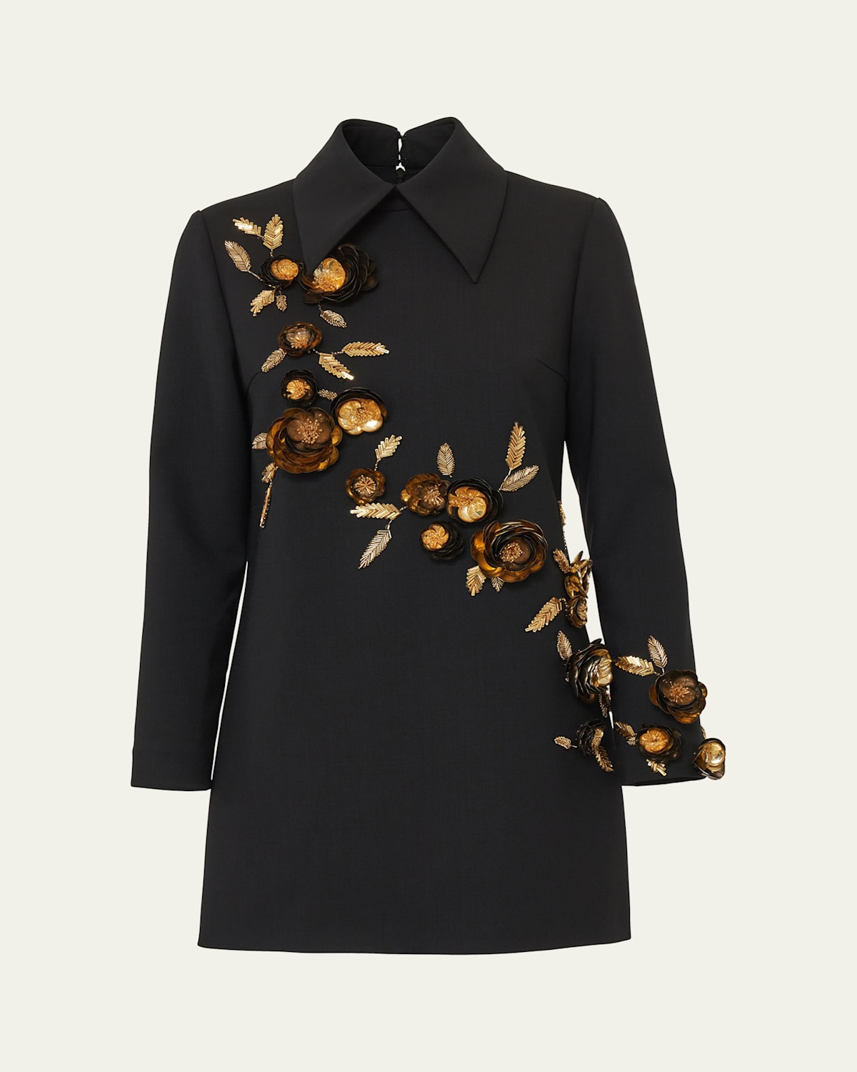 Carolina Herrera stretch wool dress complete with diagonal metallic 3D floral embellishments Oversized point collar Bracelet sleeves Hem falls above the knee Shift silhouette Invisible back zipper Virgin wool/elastane Dry clean Made in USA